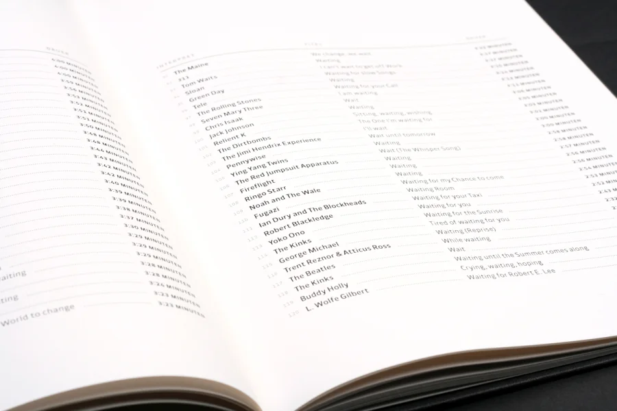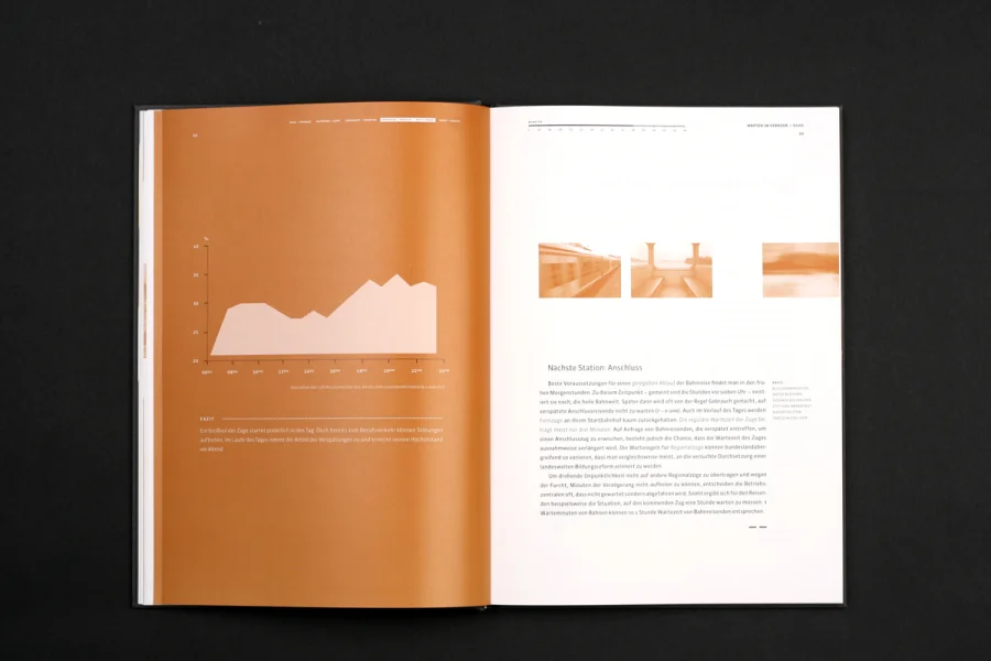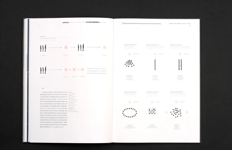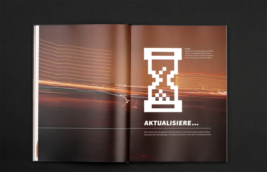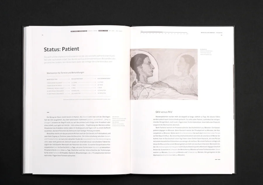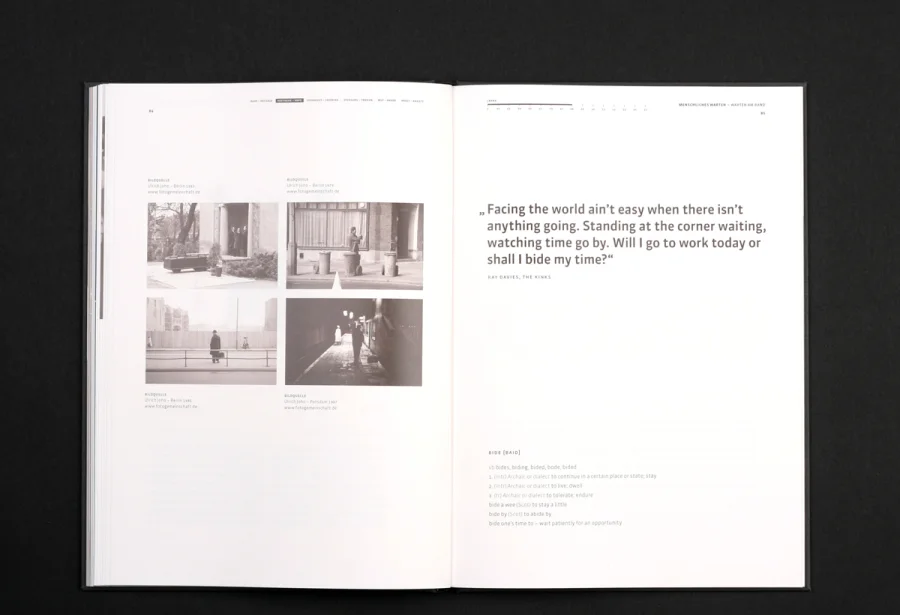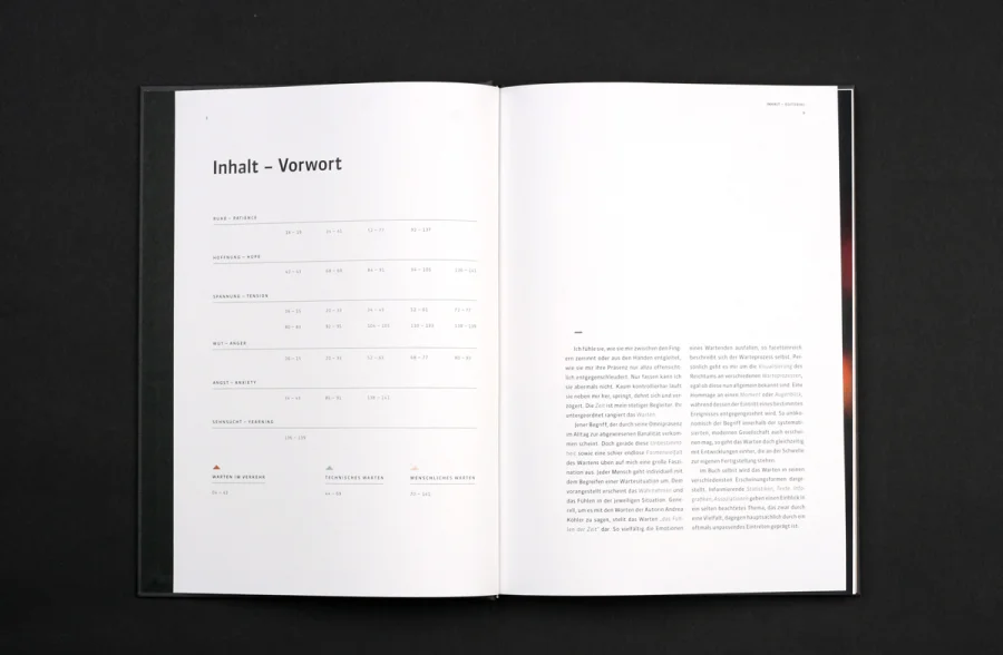 Auf der Grundlage des Buches “Lange Weile – Über das Warten” der Autorin Andrea Köhler, sowie diverser anderer Publikationen, beschäftigte ich mich während meiner Diplomarbeit mit dem Thema “Warten”. Meine Intention bestand darin ein Buch zu gestalten, das sich den vielfältigen Erscheinungsformen des Warteprozesses widmet, dabei Assoziationen mit einbezieht und analog zum Zitat ein Zusammenspiel von Emotionalität und Zeitaspekten integriert.