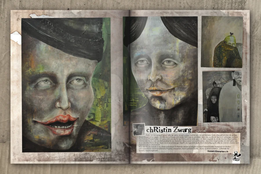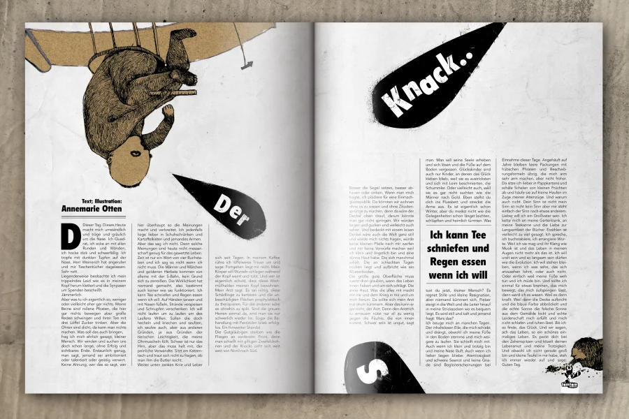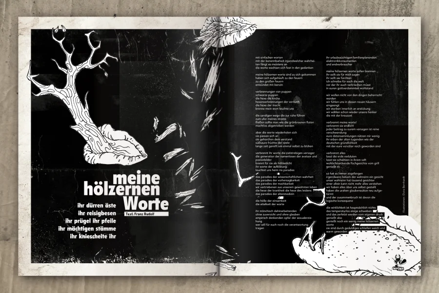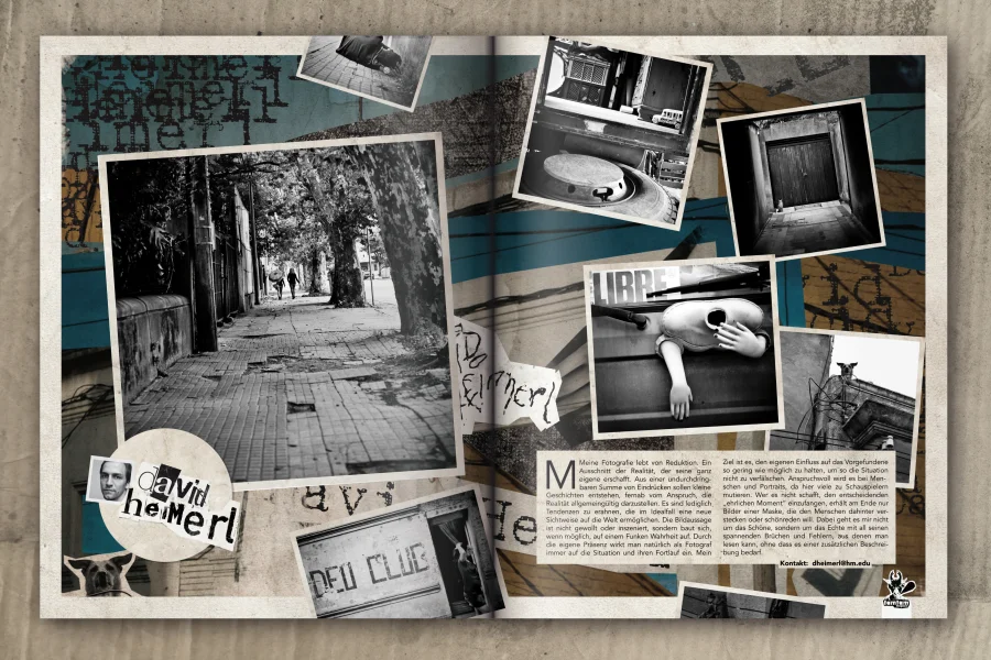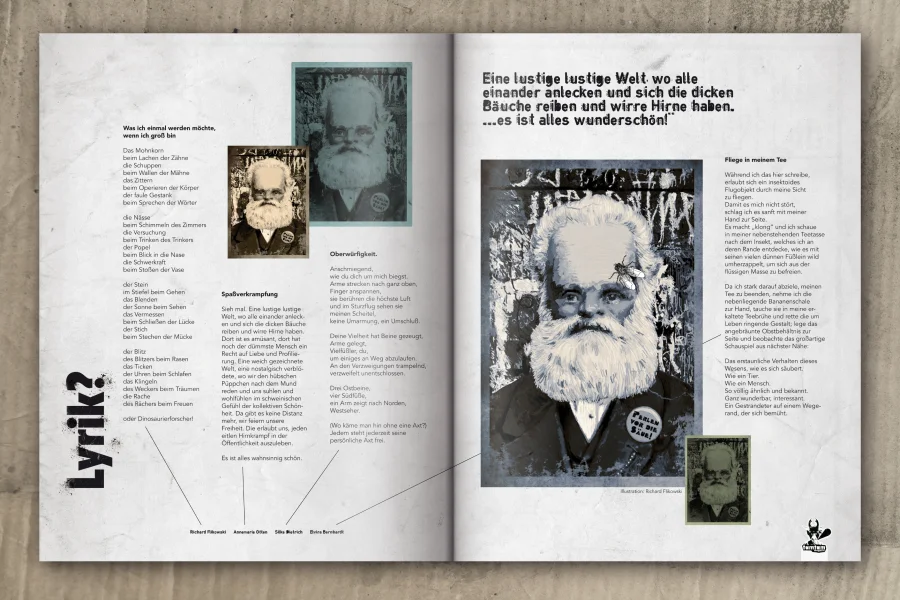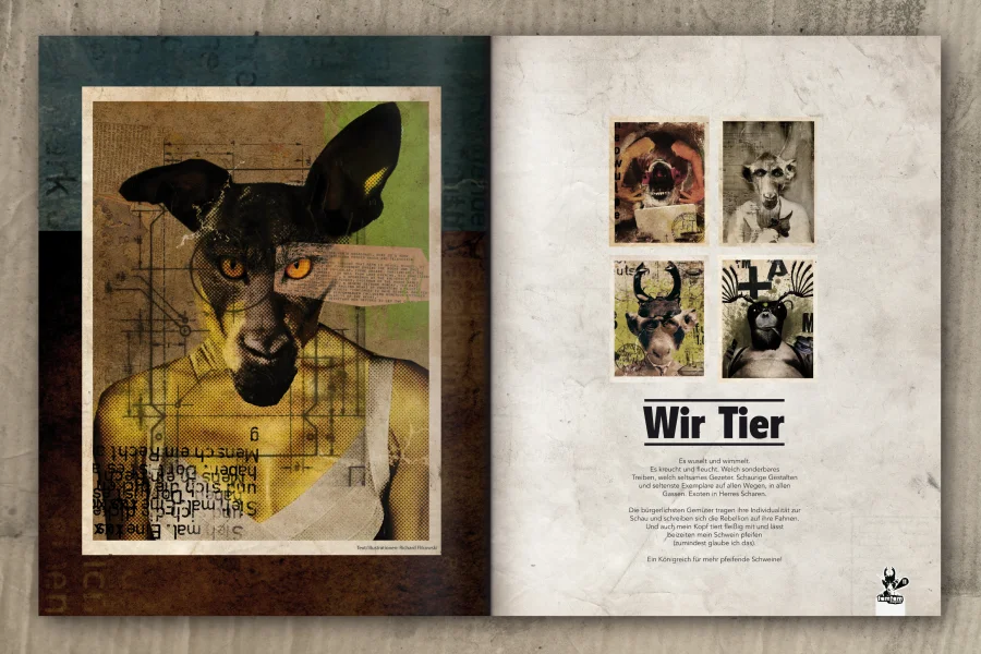 Im Rahmen einer Projektarbeit an der Design-Hochschule München, habe ich ein Magazin gestaltet, welches an die Veranstaltungen angelehnt ist und in dem neben verschiedenen Artikeln, Texten und Gedichten auch diverse Künstler-Portraits zu sehen sind. Darüber hinaus entwickelte ich ein prägnantes Erscheinungsbild für die Veranstaltungsreihe. Hierbei entstanden auch die bierernsten “Mensch-Tier-Wolpertinger”, welche immer wieder im Magazin hallo sagen und als bildliches Archivmaterial für Flyer und Plakate dienen.