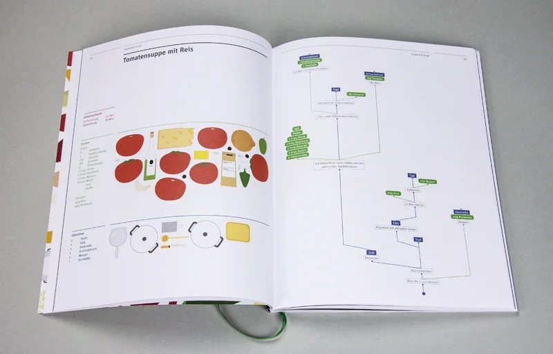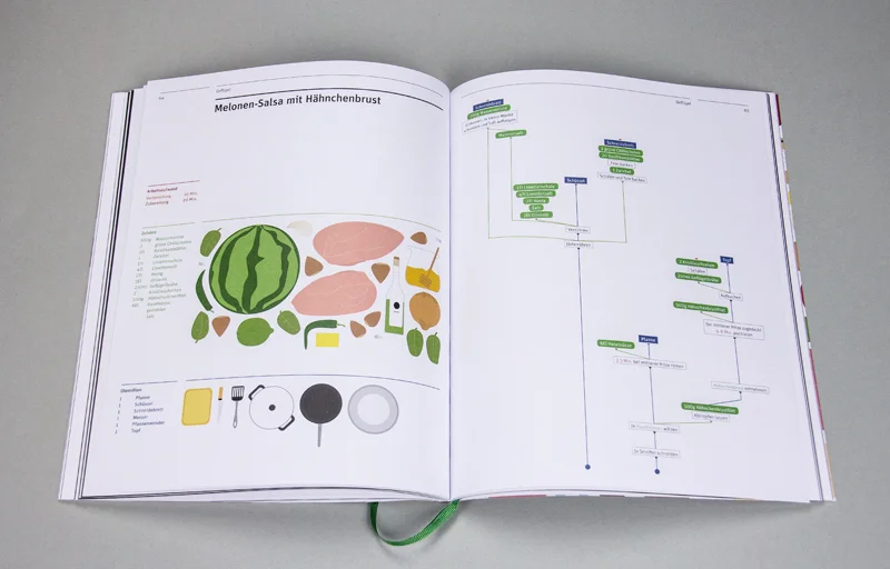 Kochen ist ein Prozess. In meiner Bachelorarbeit im Bereich Kommunikationsdesign an der FH Aachen gestaltete ich den Prozess des Kochens in einer neuen Form. Die Zutaten sind das zentrale Element eines Rezepts, aber nur durch individuelle Verarbeitung werden sie zu einem Gericht. Dieser Prozess – in einzelnen, voneinander getrennten Arbeitsschritten – funktioniert klar und einfach! Die Rezepte werden dafür in Form eines Ablaufdiagramms dargestellt. Man kocht einfach von oben nach unten, folgt den Pfeilen und arbeitet sich Schritt für Schritt in Richtung eines leckeren Gerichts. In Anlehnung an die Ablaufdiagramme illustrieren Vektorgrafiken die Zutaten und Kochutensilien.