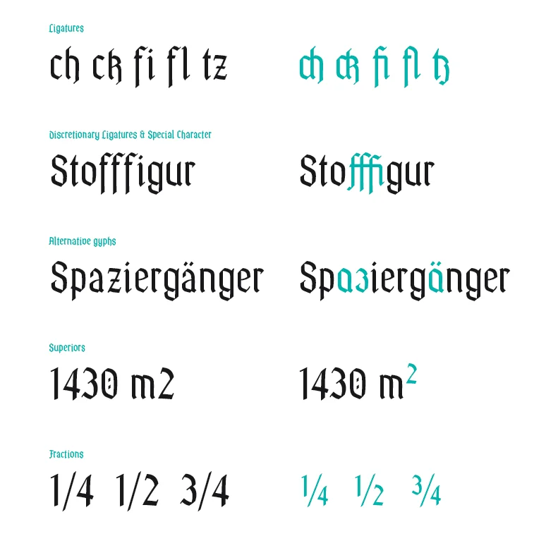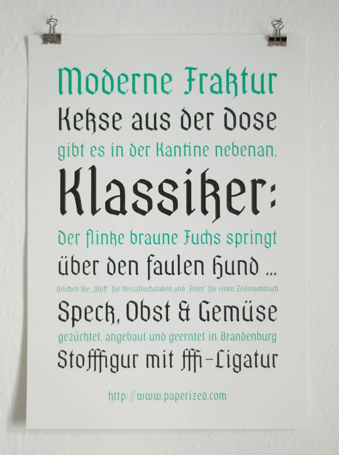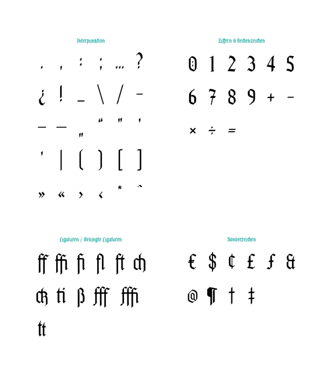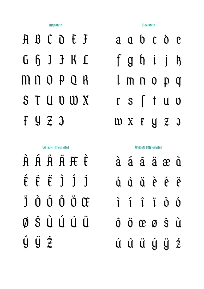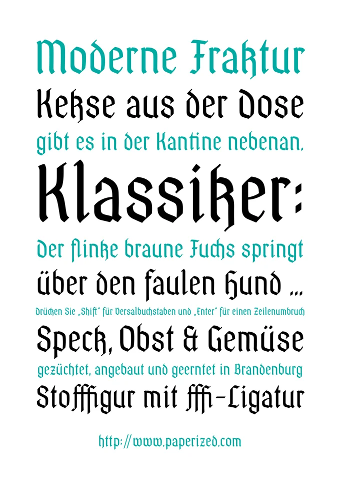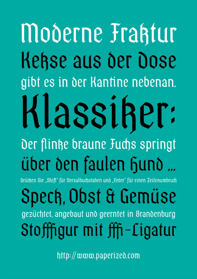 Eine Fraktur, welche die Vorteile einer Antiqua mit in sich vereint – für Mengentexte und als Headline-Schrift einsetzbar. Je kleiner der Schriftgrad, desto mehr treten die Details der Fraktur in den Hintergrund und je mehr ähnelt die Lektura einer Antiqua.