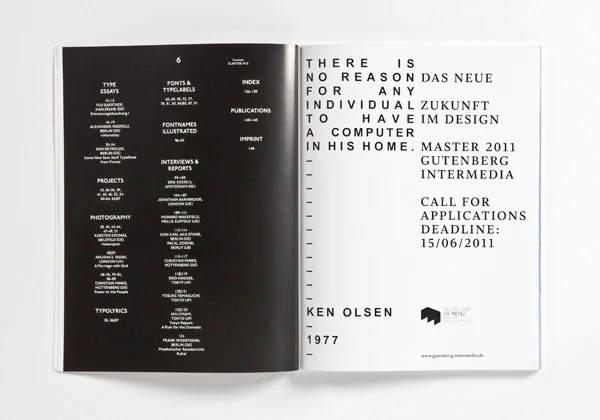 Mit Freude präsentieren wir eine Vielzahl dementsprechender und benachbarter Grotesk-Schriften, Illustrationen und Projekte. Sehenswerte Fotoreportagen sind »Heterotopien« von Karsten Kronas (Bielefeld), “A Marriage with God” von Anusha S. Yadav (London) und “Power To The People” von Christian Minke (Hüttenberg), der vor kurzem während der dortigen Revolution in Ägypten unterwegs war. Die Type Essays von Flo Gaertner (Karlsruhe), Alexander Negrelli (Berlin) sowie Dan Reynolds (Berlin) beschäftigen sich mit den Humanist Sans. Zu lesen gibt es außerdem Interviews mit Erik Kessels (Amsterdam), Jonathan Barnbrook (London), Don Karl aka Stone (Berlin) und Pascal Zoghbi (Beirut), Christian Minke (Hüttenberg), Eiko Nagase (Tokyo), Yosuke Yamaguchi (Tokyo) sowie den dritten Teil des Tokyo Reports von Ian Lynam (Tokyo) und einen weiteren musikalischen Reisebericht von Frank Wiedemann (Berlin).