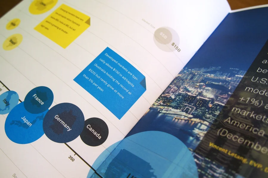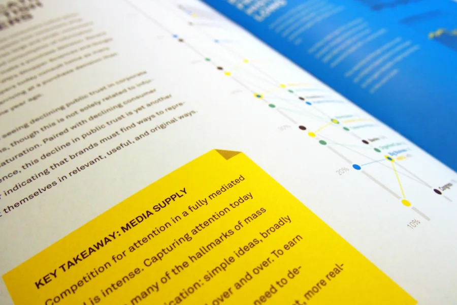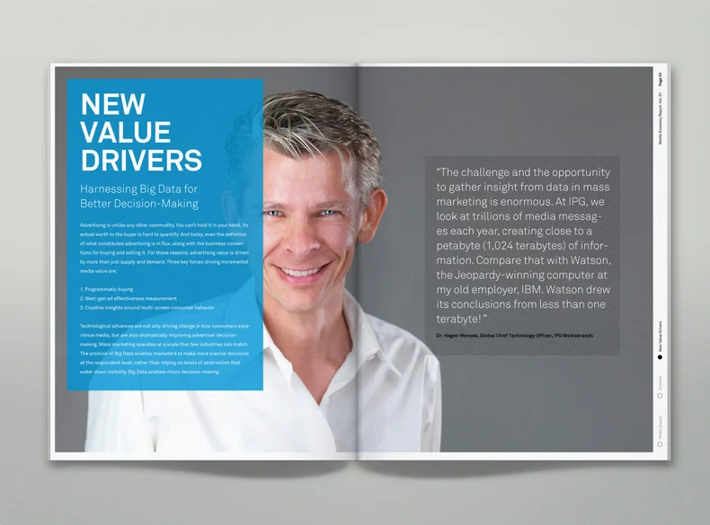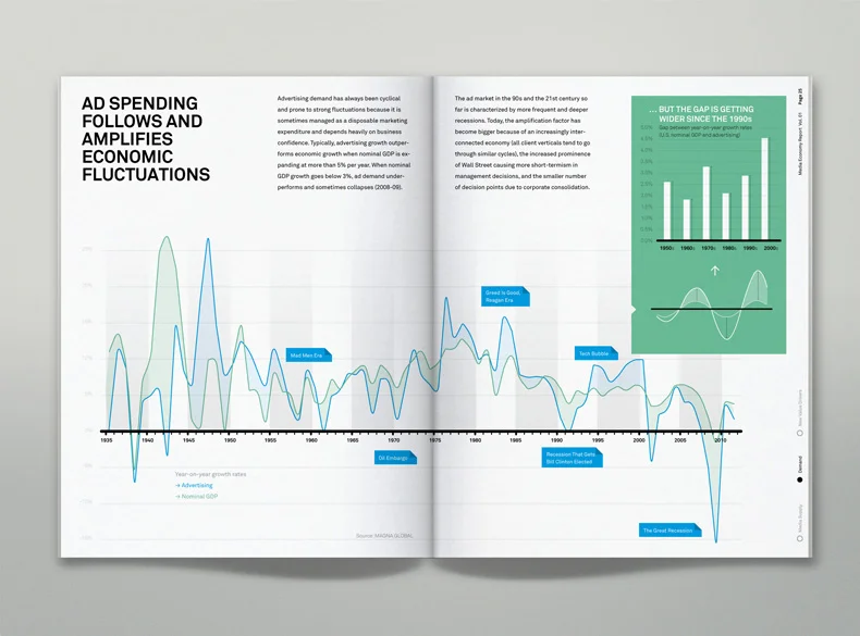 Editorial- und Informationsdesign für den ersten Media Economy Report von IPG Mediabrands. Die erste Ausgabe dieses halbjährlich erscheinenden Berichts gibt einen komprimierten Überblick über alle wichtigen Statistiken und Entwicklungen der Werbebranche. Der gedruckte Bericht wurde während der internationalen Werbefestspiele in Cannes an ausgewählte Besucher verteilt.