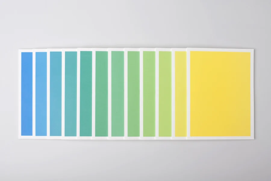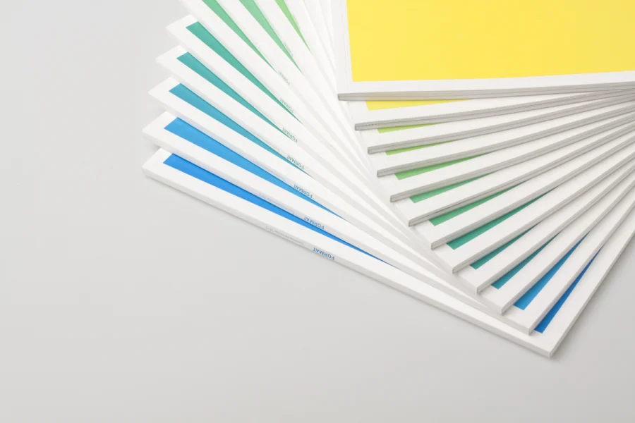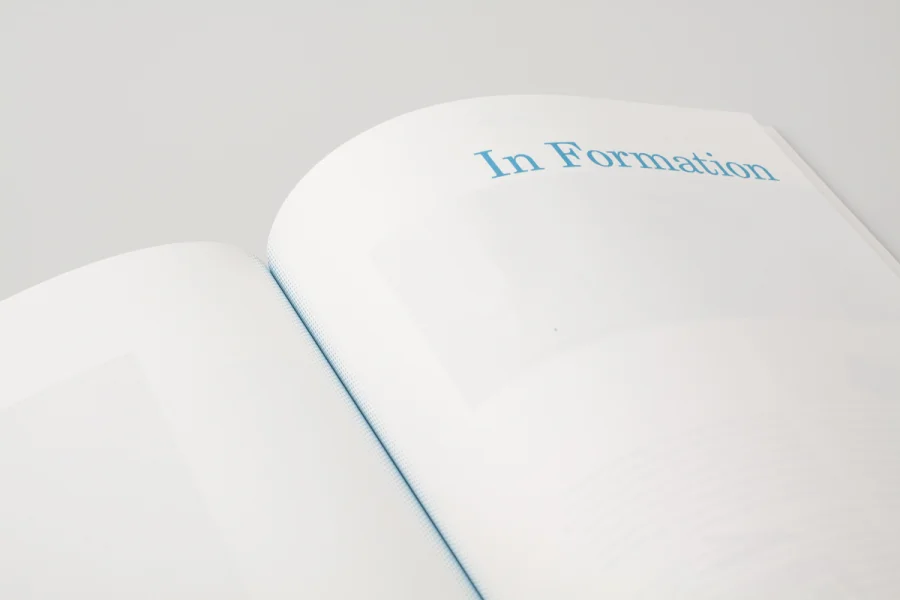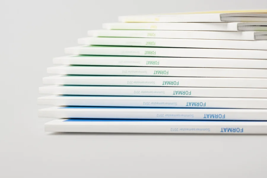 Bereits von außen ist jedes Exemplar einzigartig. In enger Zusammenarbeit mit der Druckerei konnte durch sukzessive Farbzugabe während des Druckprozesses jedes Cover mit einem individuellen Farbton versehen werden. Auf diese Weise bilden alle Hefte in ihrer Gesamtheit einen Farbverlauf von Gelb zu Cyan und damit eine homogene Einheit, während sie einzeln betrachtet selbst zum Unikat werden. Optional kann das Heftthema mit einem Stempel aufgetragen werden.