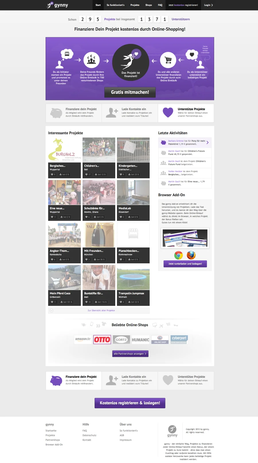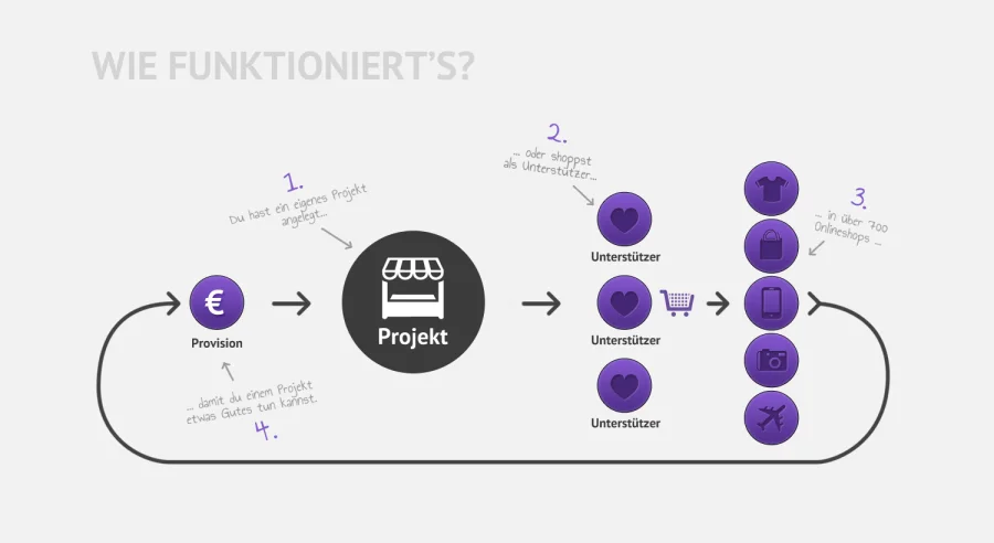 Über die Onlineplattform Gynny lassen sich Projekte jeglicher Art gemeinschaftlich finanzieren. Denn jeder Online-Einkauf bei einem der über 1000 Partner bewirkt einen Bonus, der einem Projekt zu Gute kommt – ohne, dass man einen Zuschlag oder Aufpreis bezahlen muss. Mit Hilfe von Affiliate-Provisionen, die stets direkt auf das Projekt der Wahl einzahlen, lassen sich eigene Träume oder die anderer spielend leicht verwirklichen. Denn neben privaten Projekten gibt es auch speziell gemeinnützige Initiativen, die von Gynny und den Partnern unterstützt werden. Crowdfunding, wie man es bis heute kannte, zu Ende gedacht.