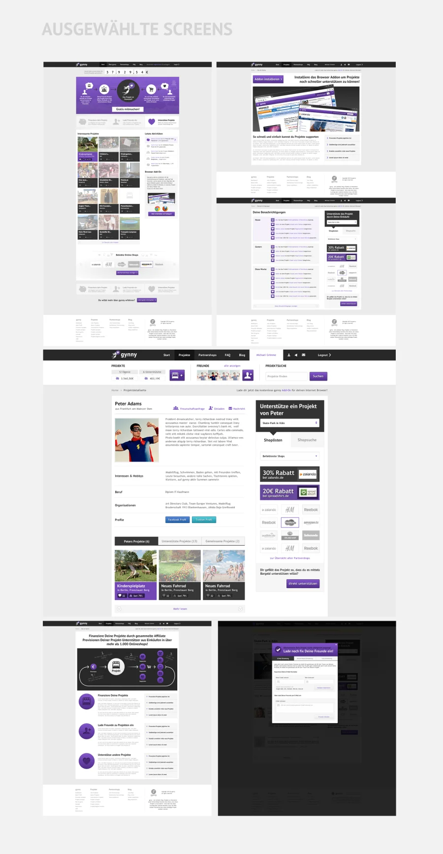 Wir – DieTaikonauten – verantworten neben der Feinkonzeption der Idee auch die Entwicklung des visuellen Erscheinungsbilds sowie die programmiertechnische Umsetzung des Portals. Dazu zählen zum einen die Anbindung der wichtigsten Affiliate-Netzwerke Deutschlands, zum anderen aber auch die Realisierung von content-sensitiven Browser Add-Ons, welche die Projektfinanzierung entscheidend vereinfacht. Mit dem Ziel maximaler Benutzerfreundlichkeit wurde das Navigationskonzept sowie sämtliche Portalfunktionen mittels funktionsfähiger Clickdummies intensiv getestet. Weiterführend zum User-Centered-Screendesign und dem Corporate Design gestalteten wir Materialien zur Selbstvermarktung sowie diverse Werbemittel für unterschiedliche Kommunikationskanäle.
