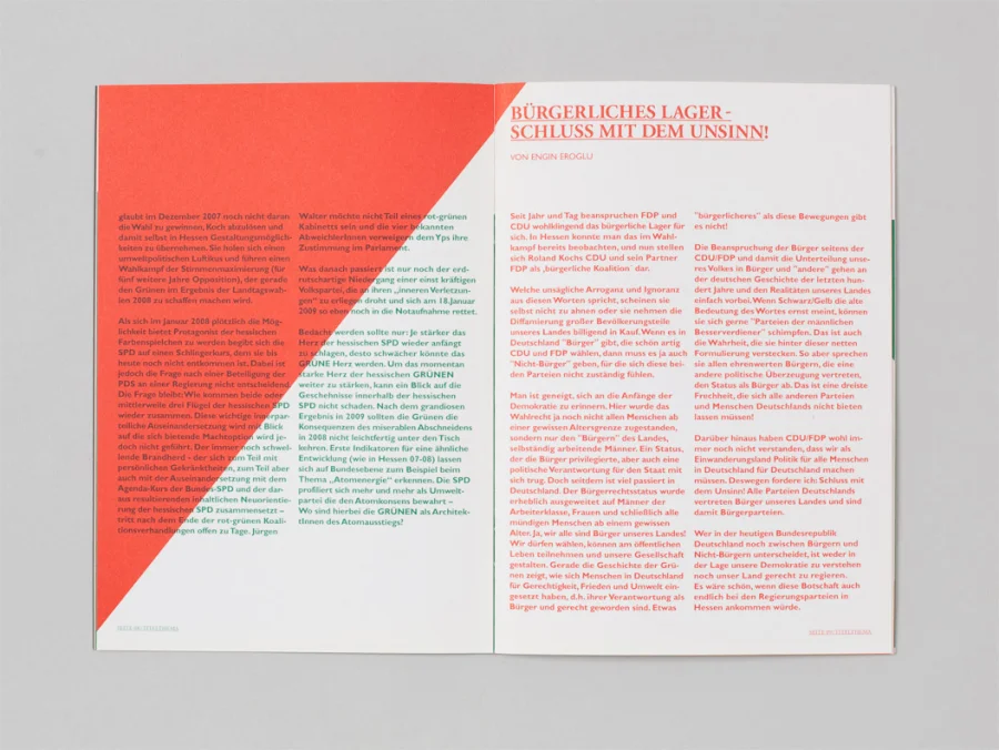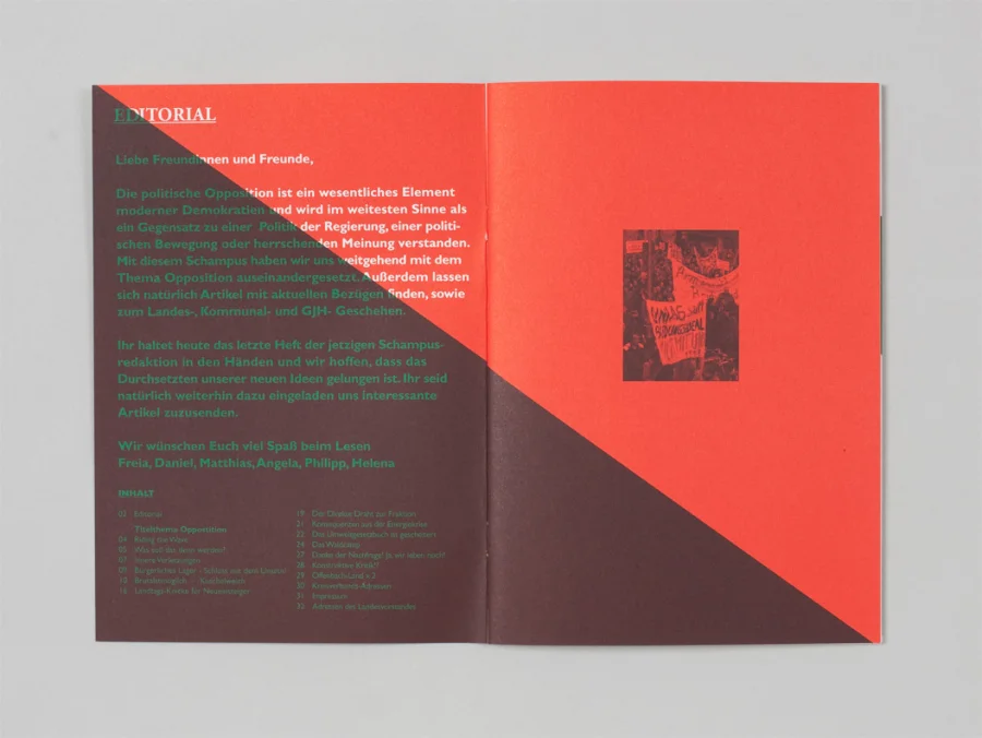 Concept, art direction, design and illustration for the magazine „Schampus“ published by the political party „Junge Grüne Hessen“