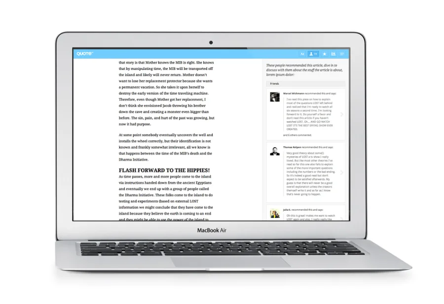 Aus diesem Grund gibt es bei der iPad-App zwei Bereiche: den Quote.fm Find und Quote.fm Read. Man erreicht sie schnell und einfach durch “Dragging” von oben nach unten. Neben vielen kleinen weiteren Neuerungen ist die iPad-App wirklich gelungen und eine Freude für Nutzer. Mit Liebe zum Detail wurde hier an Usability und User Experience gearbeitet – ein weiterer Schritt vorwärts für Quote.fm