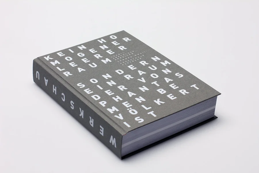 Das Cover entstand in der hauseigenen Siebdruckwerkstatt der Fakultät. Gedruckt wurde mit Weiß auf anthrazitfarbenes F-Color, ein Überzugspapier mit dem kostengünstig ein klassischer Leineneinband imitiert werden konnte. Das auf dem Einband zu lesende Zitat ist ein Auszug aus «Andere Räume» von Michael Foucault, das im Innenteil nochmals in einer längeren Version auf einer Doppelseite zu lesen ist: „Wir leben nicht in einem homogenen und leeren Raum, sondern in einem Raum, der von Phantasmen bevölkert ist.“
