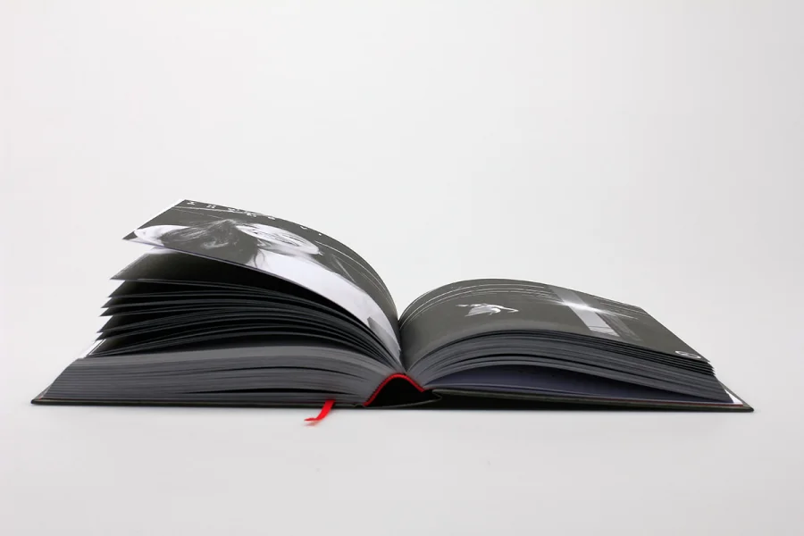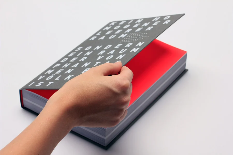 Bei der Bindung fiel die Entscheidung zugunsten eines optimalen Aufschlagverhaltens für eine Fadenheftung mit schwarzem Faden. Zeichenband und Kapitalband sind in Rot gehalten. Vor- und Nachsatzpapier wurden mit Leuchtrot bedruckt und für den Innenteil wurde ein hochpigmentiertes Schwarz verwendet.