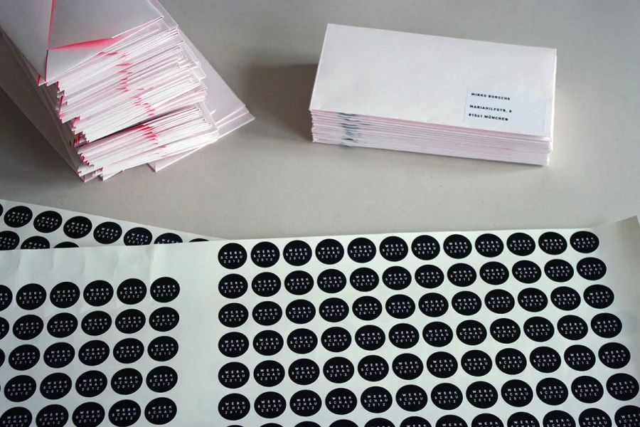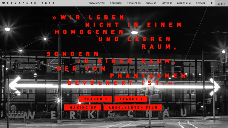 Der Leitgedanke sollte in alle Kommunikationsmaßnahmen visuell sichtbar werden. So wurde eine stark gesperrte Typografie, die sich nicht nur über die Katalogseiten ausdehnt, neben der Farbgebung – Schwarz-Weiß und die Auszeichnungsfarbe Leuchtrot – zu den Key-Visuals der Werkschau im Sommer 2012.