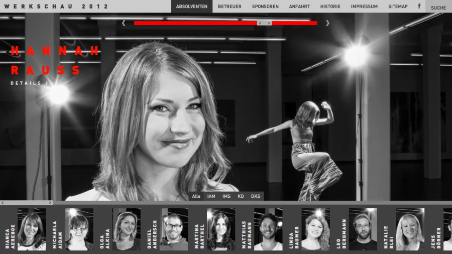 Weitere Merkmale der Website sind eine Suchfunktion, sowie die Möglichkeit über die betreuenden Dozenten auf deren Absolventen zu gelangen. Alle entstandenen Filmbeiträge wurden nach und nach auf der Startseite eingebunden, mehr dazu unter 006 Filme. Neben Anfahrt und Historie erhielten unsere Sponsoren eine eigene Unterseite mit einer kurzen Beschreibung und Links auf die jeweiligen Webauftritte. Außerdem wurde eine seperate mobile Version für Smartphones konzipiert und entwickelt.