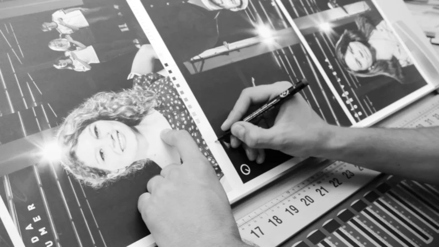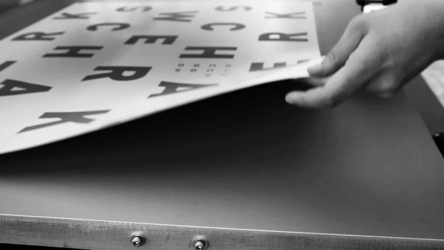 Durch eine besondere Faltung und die gesiebdruckte, grelle Farbe im Inneren sollte sie dem Betrachter wortwörtlich ins Auge springen. Im Siebdruck wurde die Schrift nicht, wie üblich, auf das Papier gedruckt, sondern entstand als Negativform durch das Papierweiß.