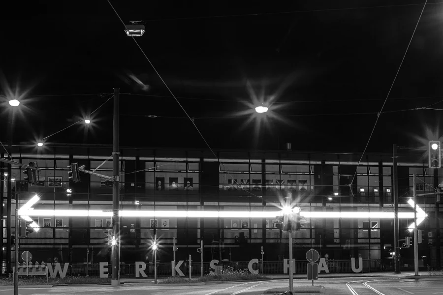 Die Installation setzte die Glasfassade unserer Fakultät in Richtung der Remboldstraße in Szene und machte Passanten, Autofahrer und Fahrgäste der vorbeifahrenden Straßenbahnen und Busse neugierig. Durch einen 39 Meter langen, leuchtenden Doppelpfeil wurde das Thema „Nach Raum greifen“ wiederum aufgenommen und visualisiert.
