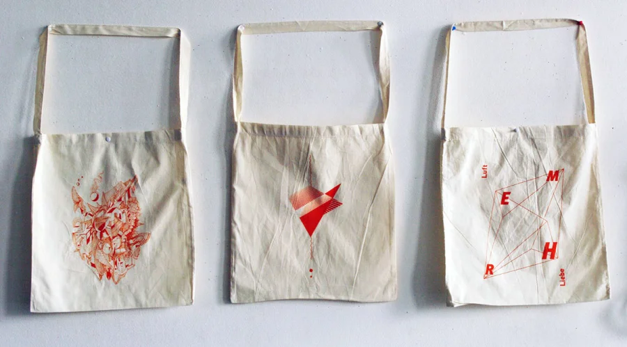 Bei den Taschen entschied sich das Team aus zahlreichen Vorschlägen, entworfen von allen Team-Mitgliedern, für drei stilistisch verschiedene Motive, die eine große Anzahl an Käufern ansprechen sollten. Mittels Siebdruck wurden die Motive auf Stofftaschen und -rucksäcke manuell angebracht.