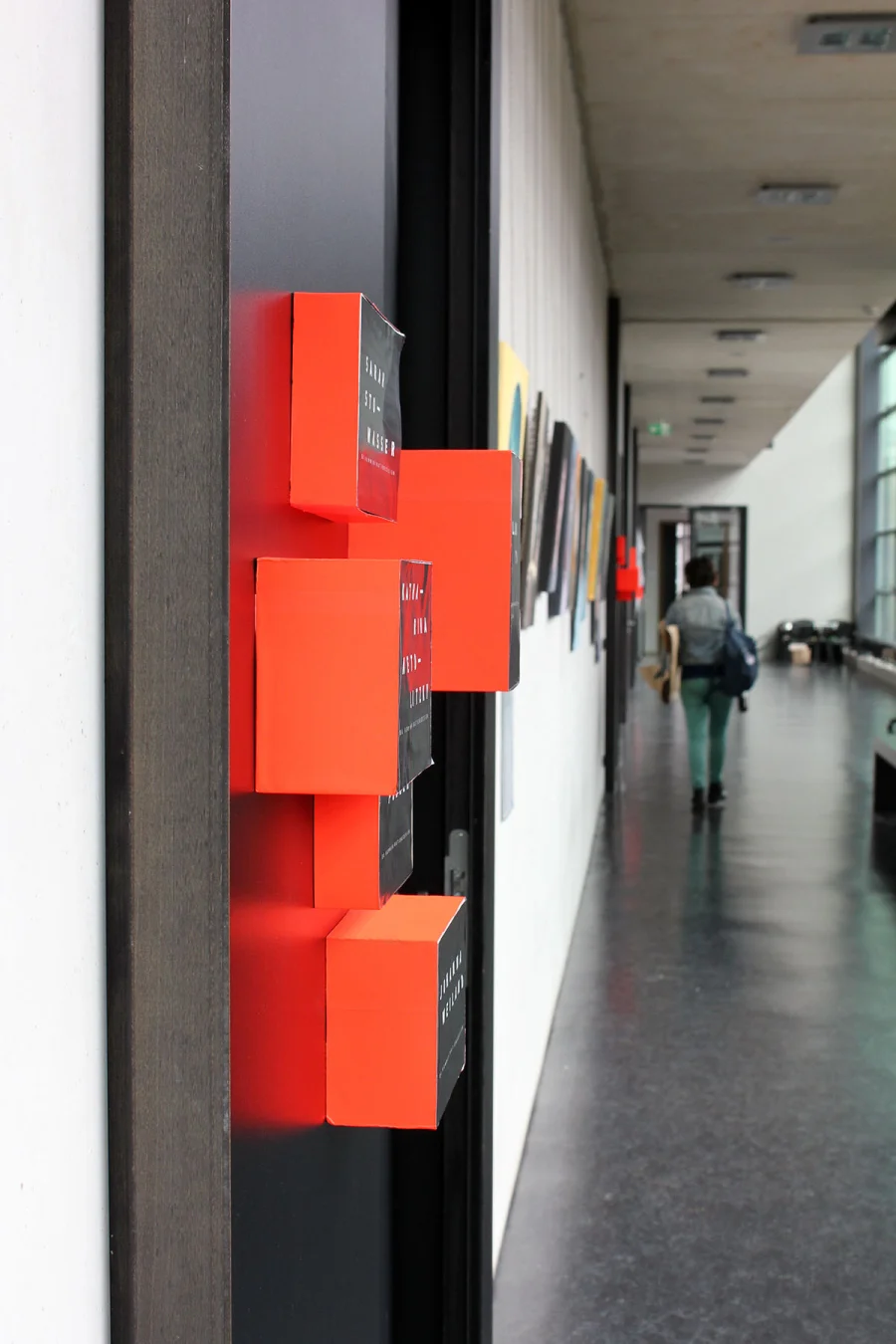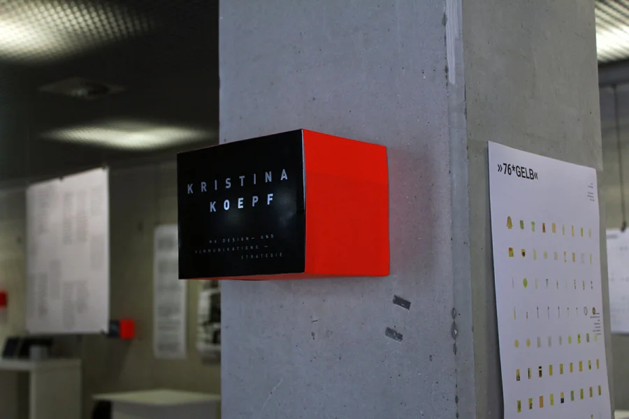 Um zu erfahren, welcher Absolvent in welchem Raum ausstellte, wurden direkt vor den Räumen dreidimensionale Türschilder in Kastenform angebracht. Die Überlegung, jedem Absolventen eine eigenes Türschild zu geben, wirkte unterstützend zum Leitfaden der Werkschau „Nach Raum greifen“.