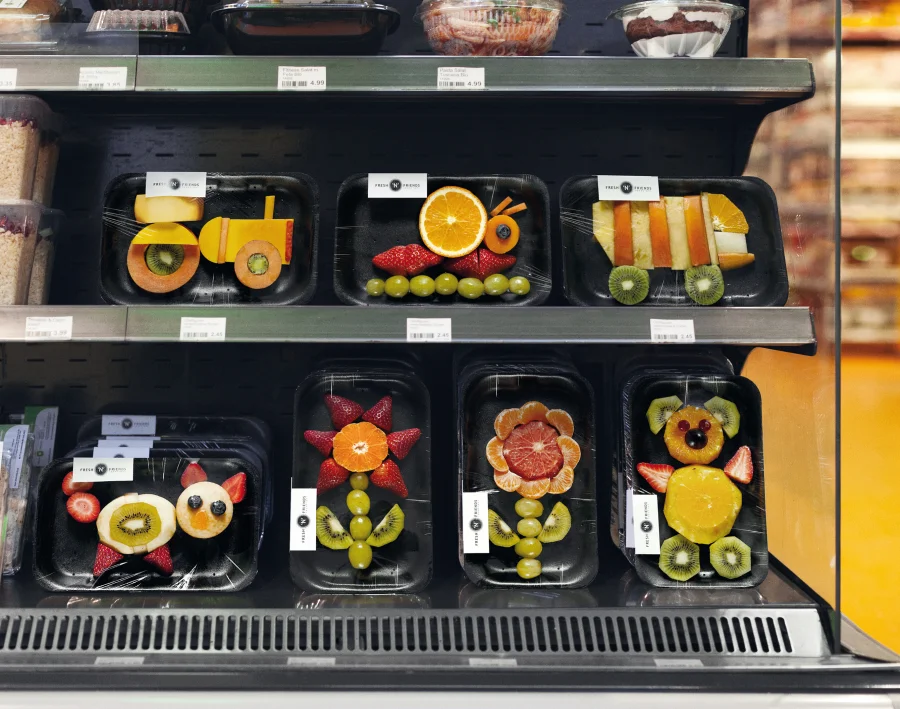Ein neues Produkt: die Obstfiguren. Das sind Obstsalate, bei denen das Obst in kindgerechte Motive gelegt ist. Z.B. Obst-Teddybären, Obst-Katzen oder Obst-Blumen.