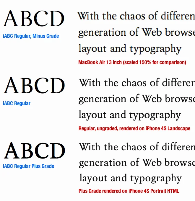 Die Verwendung den Schriftgraden für verschiedene Medientypen ist an sich kein neuer Gedanke. Schon seit einiger Zeit verwendet man verschiedene Grades um verschiedenen Papierqualitäten gerecht zu werden. Bei Bildschirmen verhält sich das nicht anders. Ein grobkörniger Bildschirm ist wie ein Fließblatt, ein Retinadisplay ist wie eine PVC-Leuchtkasten auf das gestanzte Plastikbuchstaben aufgeklebt werden. Dazwischen gibt es einen Graubereich, bei dem wiederum andere Qualitäten im typografischen Atombereich wie auch im Molekülbereich vonnöten sind.