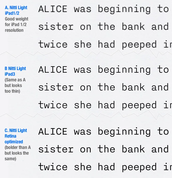 Man schaut sich das Schriftbild in den Leseabständen an, die die physische Eigenart des Gerätes mit sich bringt. Beim iPad ist das unglaublich schwierig, weil hier Text sowohl aus nächster Nähe (auf dem Bauch im Bett) wie auch in Armdistanz (auf dem Sofa) gelesen werden kann. Daraus ergibt sich die Schriftgrösse und damit der Hauptfaktor jedes typografischen Systems. Man muss dieses System in verschiedenen Bildschirmgrössen und Granularitäten durchdeklinieren, bis man ein einigermassen stimmiges Responsive Design hat. Dabei entdeckt man die riesigen Unterschiede zwischen den Renderings der Schrift. Mir ist erst erst beim ausgiebigen Testen aufgefallen, dass, um eine effiziente Typografie auf verschiedenen Geräten hinzukriegen, nicht bloß verschiedene Layouts mit verschiedenen typografischen Feinheiten sondern auch verschiedene Schnitte notwendig wären. Und wie so oft bei typographischen Dingen: Wenn man es einmal sieht, kann man es nicht mehr wegsehen.