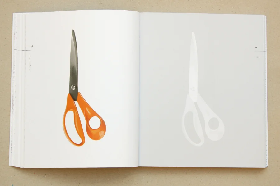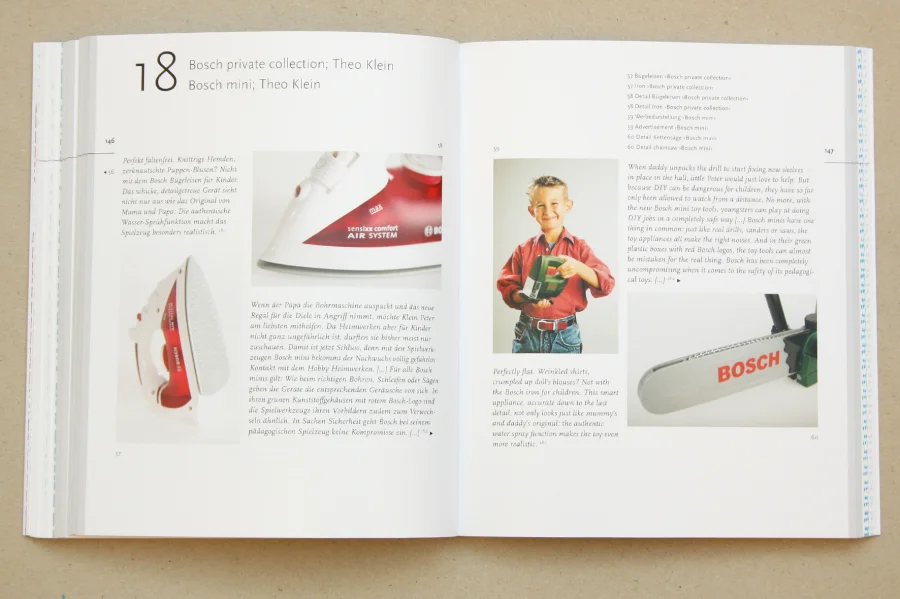 Im zweiten Teil »Uncodierte Schätze« gibt es keine Gegenüberstellung und keine eindeutige Kaufzuweisung. Beim Betrachten der Objekte, die jeweils auf einer Doppelseite dargestellt werden, schießt mir der Begriff »funktionell« in den Kopf. Denn fehlen diese eindeutigen Zuordnungsaspekte, so scheint es, dass ein Gegenstand erstmals das sein kann, was er doch vielleicht öfters sein sollte: ein Gebrauchsgegenstand. Nicht beschränkt, aber doch fokussiert auf eben diesen Gebrauch. Der Bosch Schraubenzieher oder die WMF Kaffeepadmaschine sind hier wirksam aufgezeigte Beispiele.
