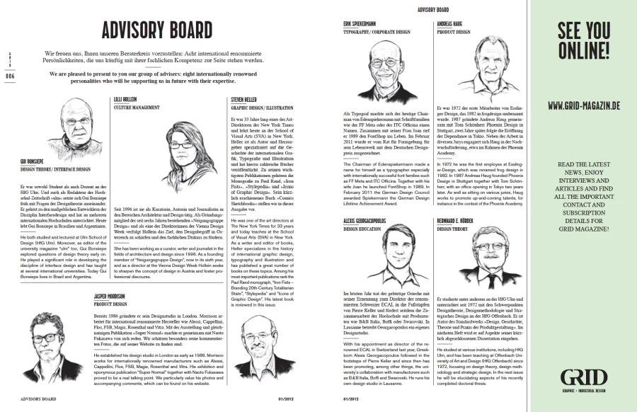 Trotz iPad und neuen technischen Möglichkeiten für Verleger und Verlage, ist das klassische Printmagazin nicht totzukriegen, was man an regelmäßig erscheinenden neuen Formaten sieht. Der ehemalige Chefredakteur der form, Gerrit Terstiege, wagte sich jetzt an ein neues Magazin für Gestalter – GRID. Das Kürzel GRID, dessen Wortmarke, die Peter Schmidt Group gestaltet hat, steht dabei für die Zusammensetzung aus Grafik (GR) und Industriedesign (ID) und der Bezug zum Rasterbegriff ist auch nicht ganz zufällig.