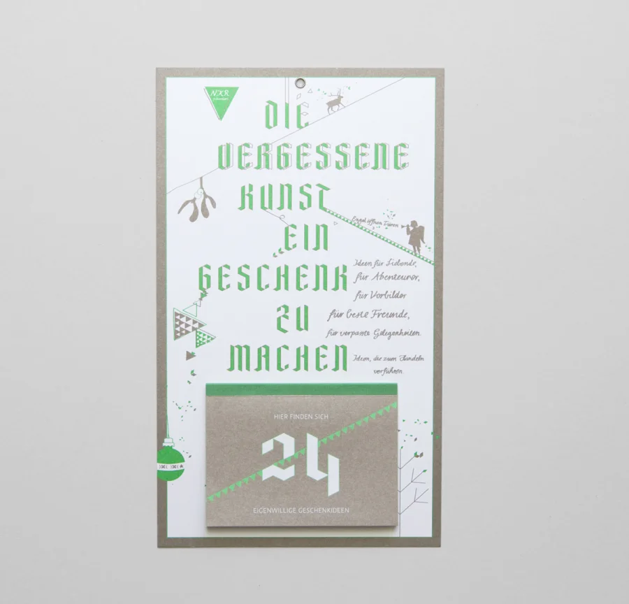 Der diesjährige Benefiz-Adventskalender des NKR widmet sich der vergessenen Kunst, ein Geschenk zu machen. Hinter seinen Türchen verbergen sich 24 eigenwillige Geschenkideen als Abreißblätter. Die Bezeichnung vergessene Kunst ist dabei ganz gewusst gewählt, denn sie mahnt den Trend an, dass unter dem Einfluss des Konsumwahns und des Weihnachtsstresses zu oft auf die einfache Möglichkeit des blossen Produktkaufs zurückgegriffen wird, anstatt dem Geschenk an sich einen kreativen Raum zu geben. Der Adventskalender, der traditionell die Tage im Dezember bis zum Heiligen Abend markiert und so die Vorfreude auf Weihnachten durch kleine Überraschungen, Schokolade oder individuelle Kleinigkeiten befeuert, wird durch das Thema des Schenkens an sich zur vierundzwanzigtägigen Weihnachtsinspiration. An jedem Tag wartet der Kalender mit einer neuen, originellen Geschenkidee auf, die abseits von immer gleichen Produktempfehlungen und schnöden Gutscheinen den Geist von Weihnachten als Fest von Harmonie und Familie verbreiten soll, bei dem die Kunst des Schenkens mehr ist als eine Shoppingtour. Dabei entsteht ein eigenwilliger Adventskalender, der sich der grossen Frage der Vorweihnachtszeit widmet: Was kann man wem schenken? In 24 kleinen Weihnachtsinspirationen sollen besondere Antworten dazu anregen, Weihnachten mehr als Chance für einzigartige Aufmerksamkeiten und weniger als Stress vor dem Ladenschluss zu sehen.