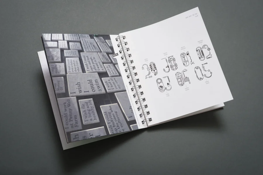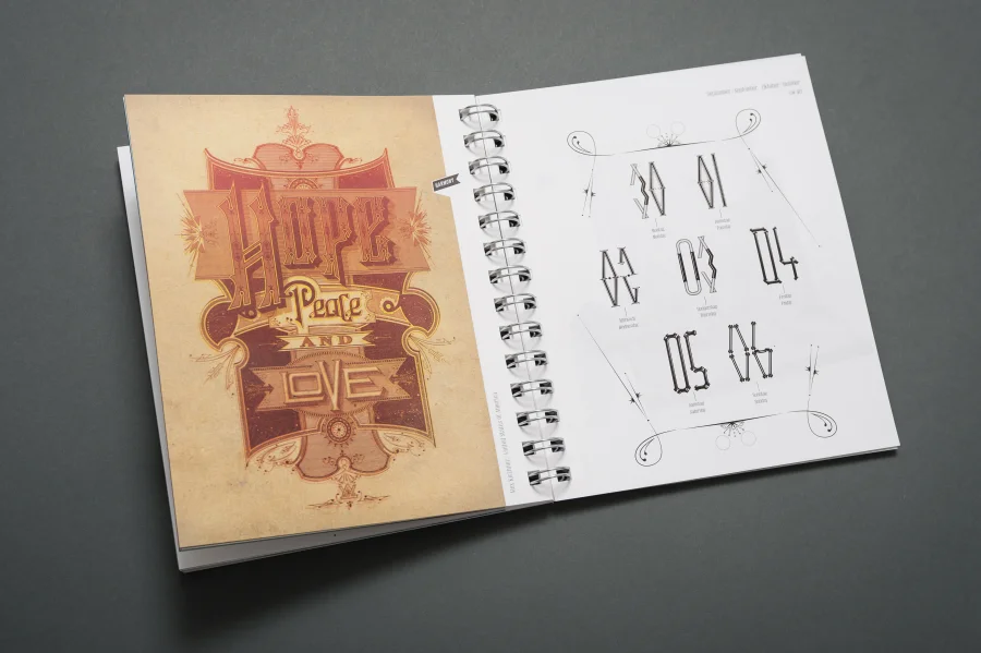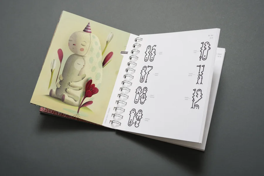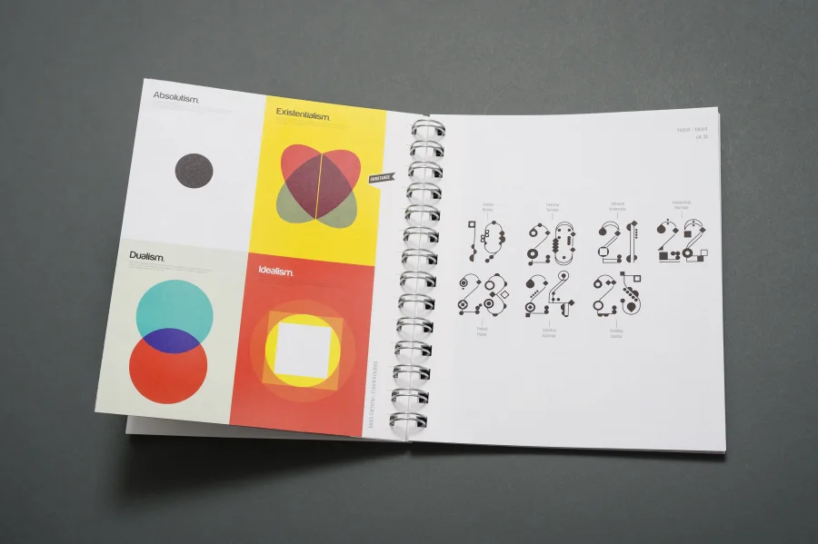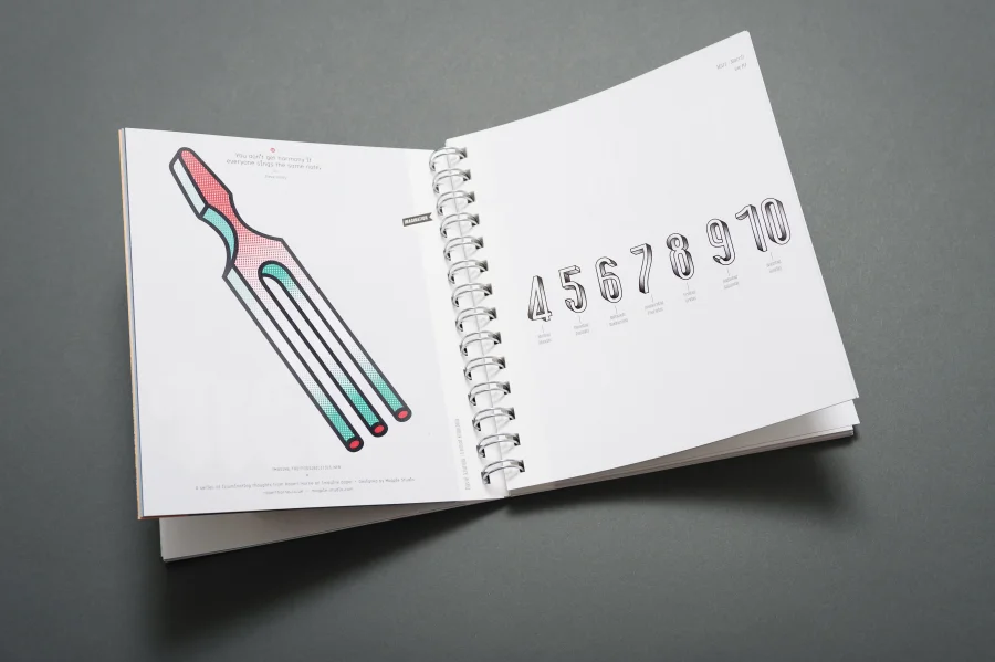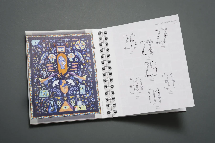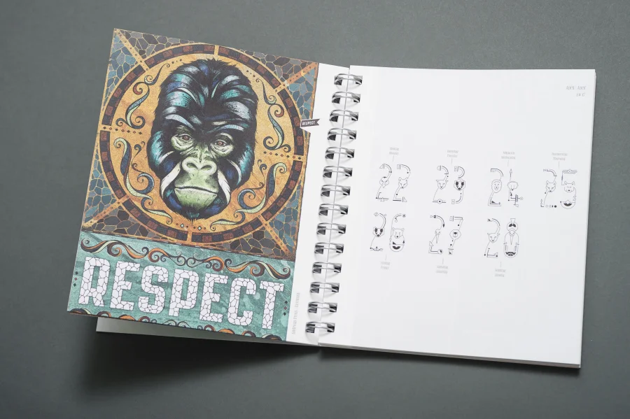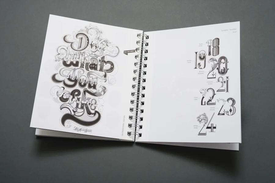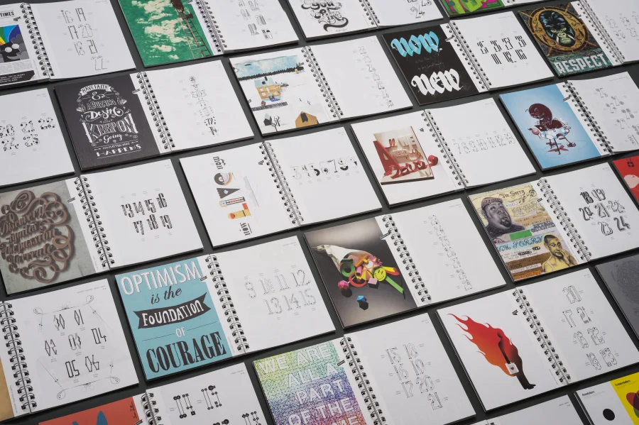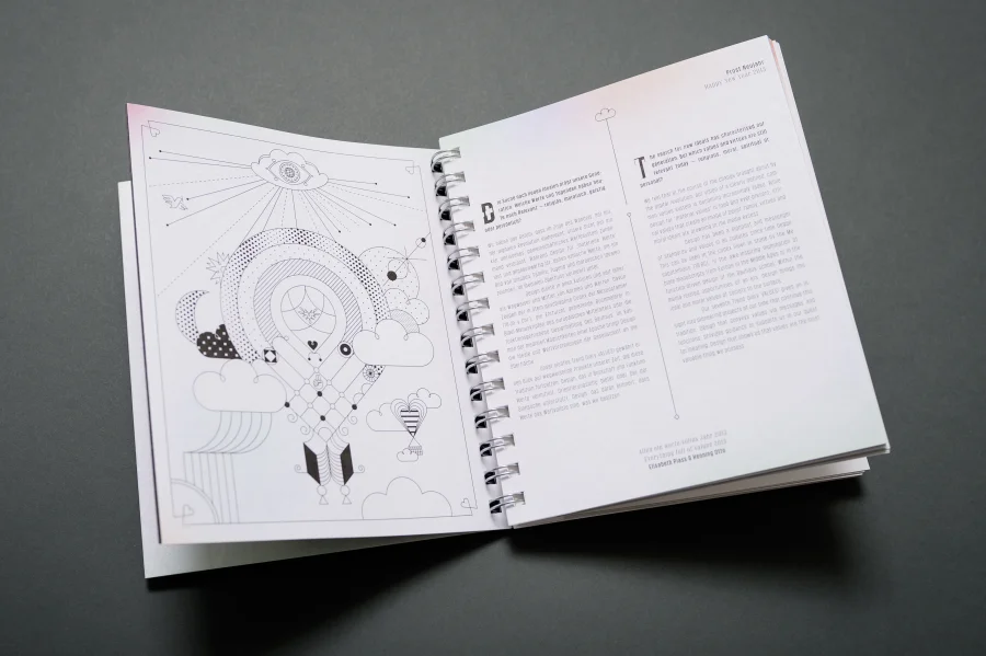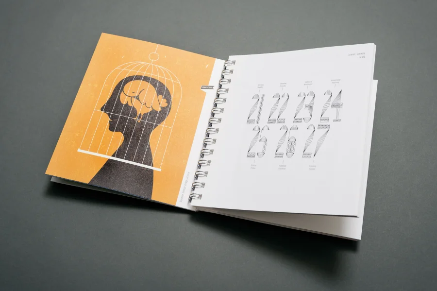 Wie in allen vielfach ausgezeichneten Trend Diaries spielen auch in diesem Projekt experimentelle Typografie und wegweisendes Grafik Design eine zentrale Rolle. Eigens für dieses Projekt haben die Gestalter von Eiga eine Schrift entwickelt, deren fraktale Zeichen sich – wie das Werteempfinden einer Gesellschaft – immer wieder neu zusammenfügt. Darüber hinaus entstanden für die Kalenderwochen individuelle 53 Kalendarien, die Bezug auf die jeweils vorgestellte Arbeit nehmen, sich jedoch dennoch einem einheitlichen Gestaltungsprinzip unterordnen.