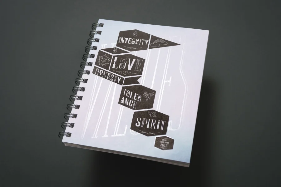 Das Trend Diary im Format eines Jahreskalenders versammelt inspirierende Arbeiten von 53 Designern. Design das in Botschaft und Funktion Werte vermittelt, Orientierungshilfe bietet oder bei der Sinnsuche unterstützt; kurzum, Design das uns daran erinnert, dass Werte das wertvollste sind, was wir besitzen.