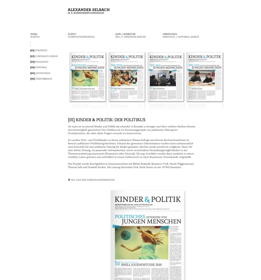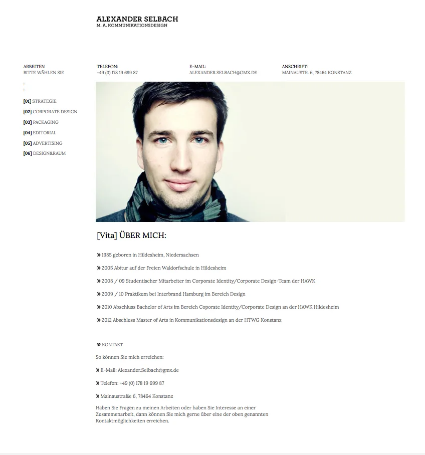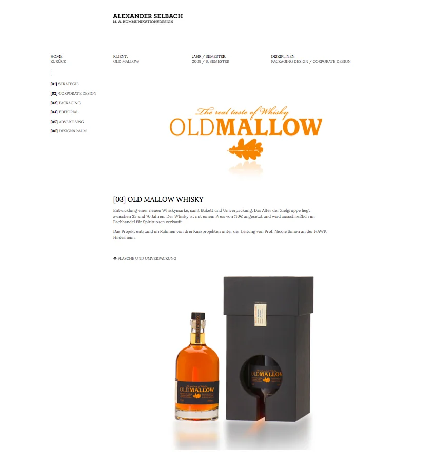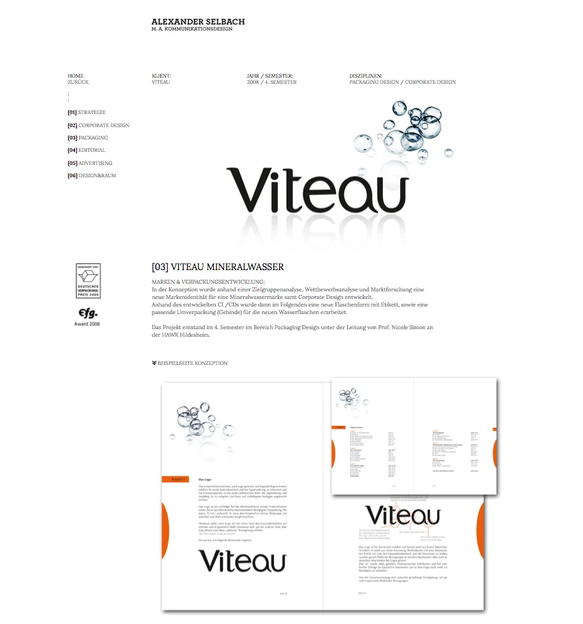 Webportfolio von Alexander Selbach mit Arbeitsproben aus den Bereichen Strategie, Corporate, Packaging, Editorial, Advertising sowie Design & Raum. Die gezeigten Arbeiten entstanden überwiegend im Rahmen des Bachelor- und Masterstudiums in den Jahren 2007 bis 2012.