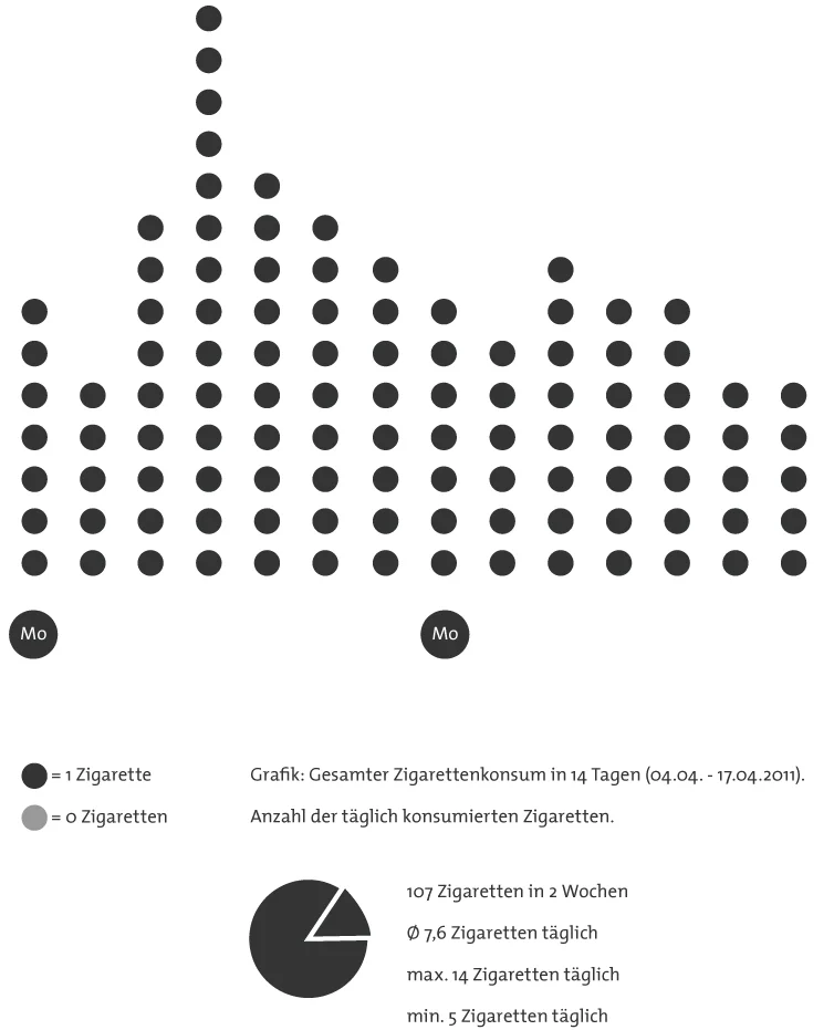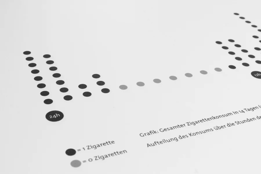 Hier seht ihr ein paar Ausschnitte einer statistischen Datenvisualisierung von fiktiven Daten zum Thema Zigarettenkonsum. Mein Ziel war es die Informationen optisch ansprechend, kompakt und reduziert darzustellen.