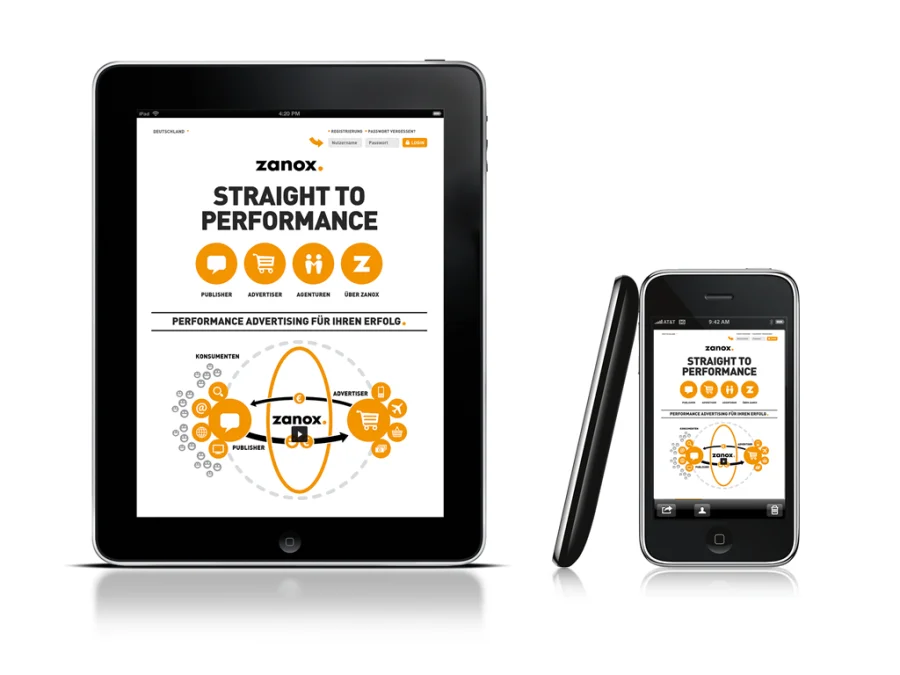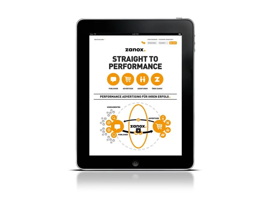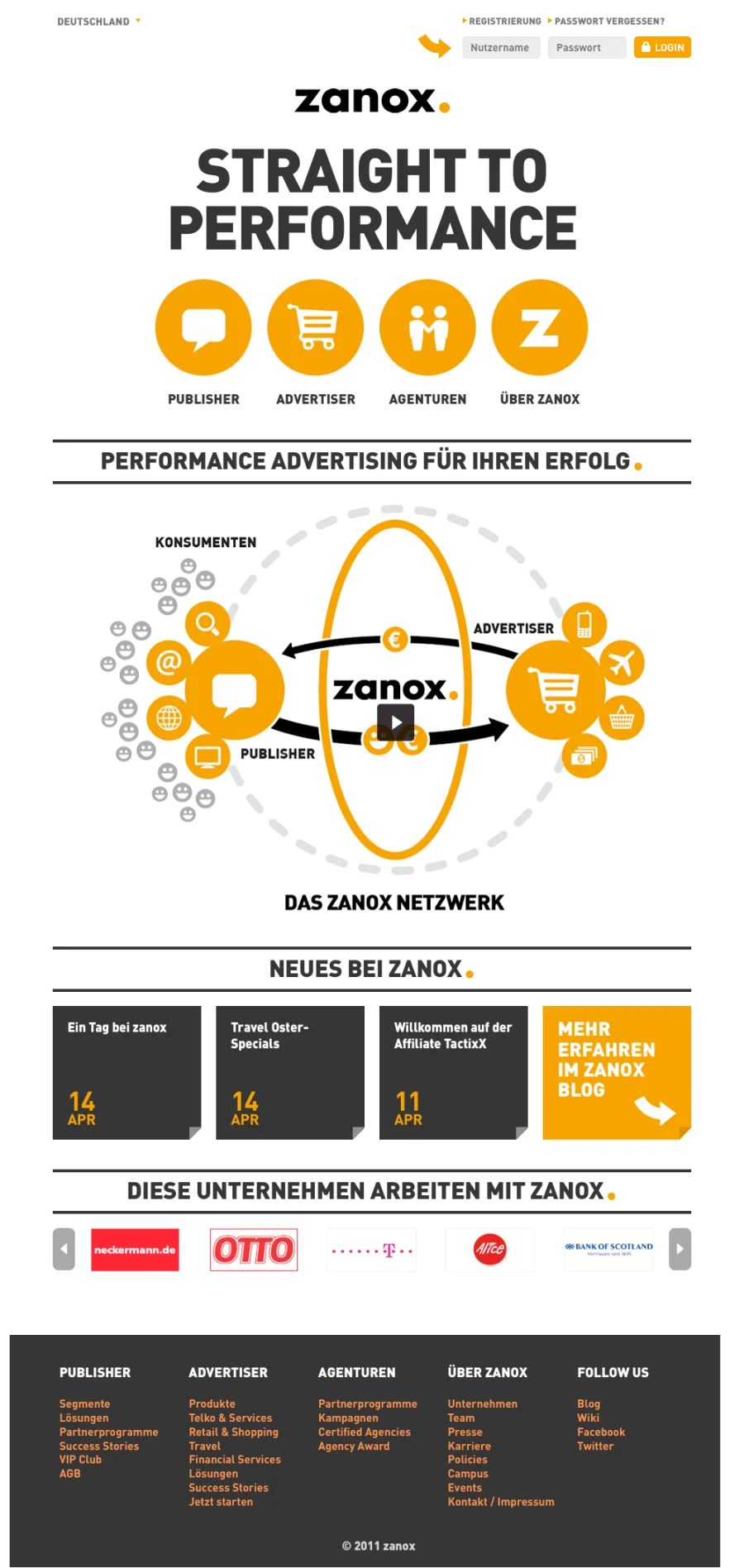 Die Internet AG zanox hat eine neue Website, die im Rahmen des neuen Corporate Designs umgesetzt wurde. Visuelle Grundlage des Designs ist die Firmenphilosophie “Straight to Performance”. Die Gesamtgestaltung ist plakativ, flächig und kontrastreich. Das neue zanox Website-Design ist für unterschiedliche Plattformen und Nutzungsszenarien konzipiert. Großzügige Gestaltungselemente machen die Website auch auf mobilen Endgeräten wie Smartphones oder Tablet-Computern ohne größere Einschränkungen nutzbar. Offene Standards wie HTML5 und Javascript ersetzen die bisherigen Flash-Inhalte. Interaktionselemente wurden unter Berücksichtigung des Einsatzes auf Touch Screen Displays gestaltet und getestet. Statt Paging optimiert zanox umfangreiche Inhaltsseiten für vertikales Scrollen. Die Fließtext- und Inhaltsdarstellungen entsprechen den neuen Anforderungen des universellen Designs. Die Farbpalette wurde dem Corporate Design entsprechend vereinfacht, Farbverläufe wurden entfernt. Das neue zanox-Webportal ist komplett mit Webfonts aufgebaut, Systemschriften dienen nur als Fallback und werden in der chinesischen Version eingesetzt.