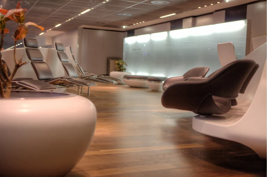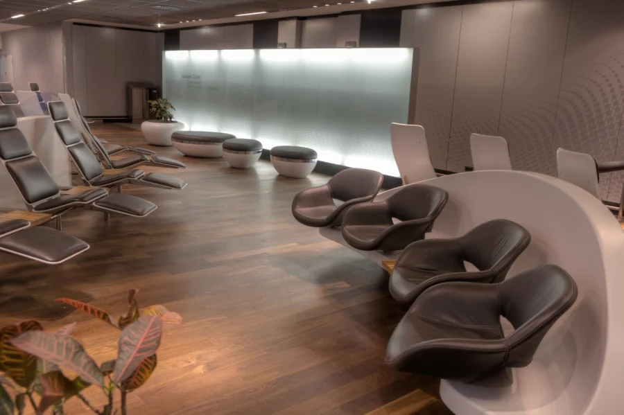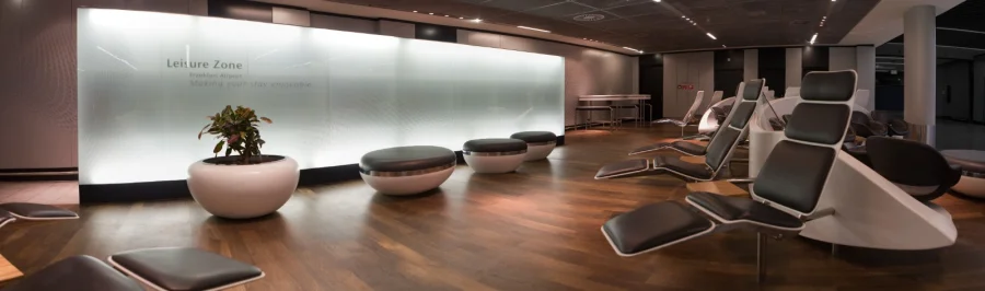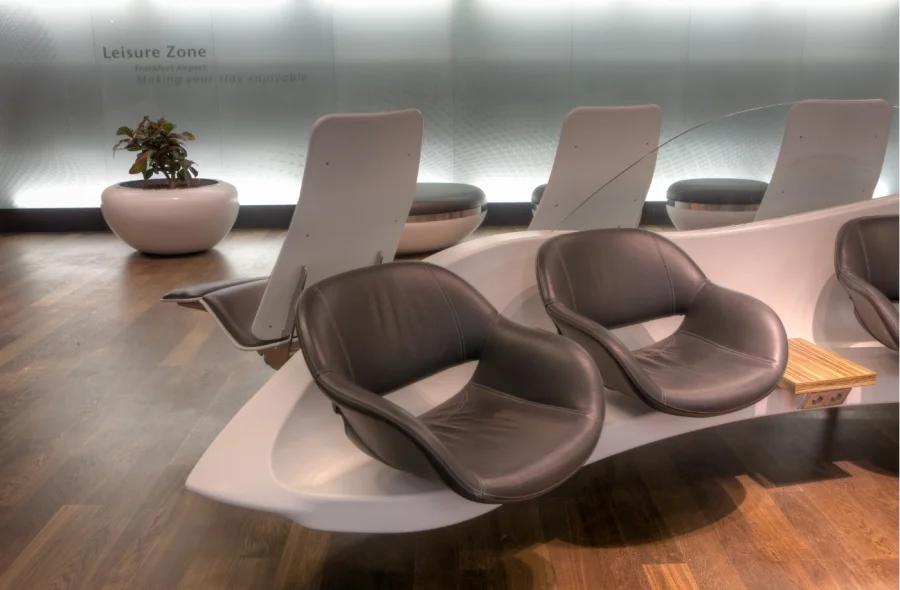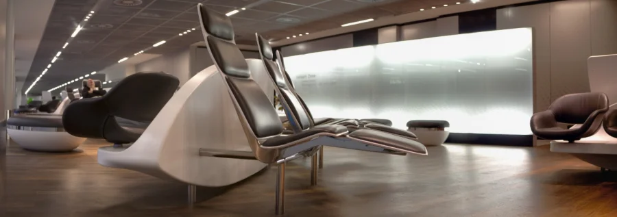 Mit ihrem dynamisch geschwungenem Interior Design und ihrer hellen und positiven Atmosphäre heben sich die komfortablen Ruhebereiche deutlich von konventionellen, üblicherweise streng linear gestalteten Wartehallen ab. Zentrales Gestaltungselement sind geschwungene Freiformen aus weißem Mineralwerkstoff, dessen homogene Oberflächen als haptisch besonders ansprechend empfunden werden. Die Freiformen nehmen unterschiedliche Sitzmöbel sowie Ablagetische mit Stromanschlüssen für mobile Bildschirmarbeit in sich auf und bieten so höchsten Komfort. Von 3deluxe eigens für diesen Kontext entwickelte, komfortable Liegemöbel bieten Rückzugsmöglichkeiten auch für längere Wartezeiten. Bei der Materialwahl des gesamten Mobiliars wurde spezielles Augenmerk auf Hochwertigkeit und Strapazierfähigkeit gelegt, da es im 24- Stunden-Betrieb des Flughafens sehr stark beansprucht wird.