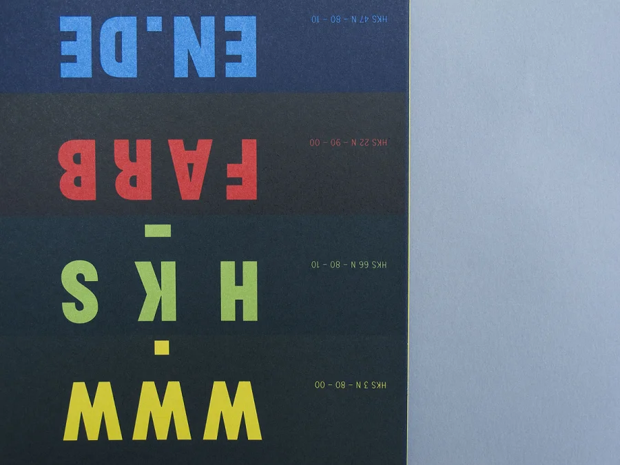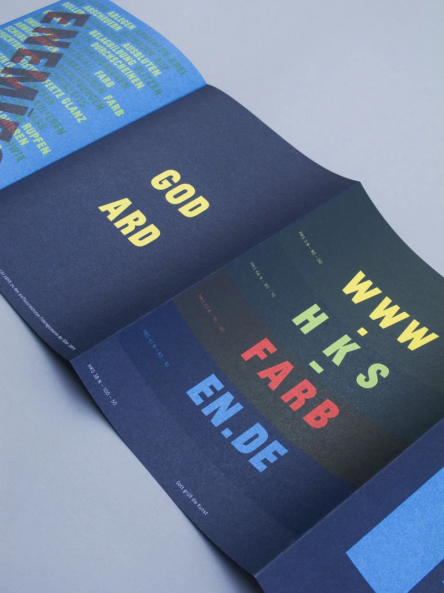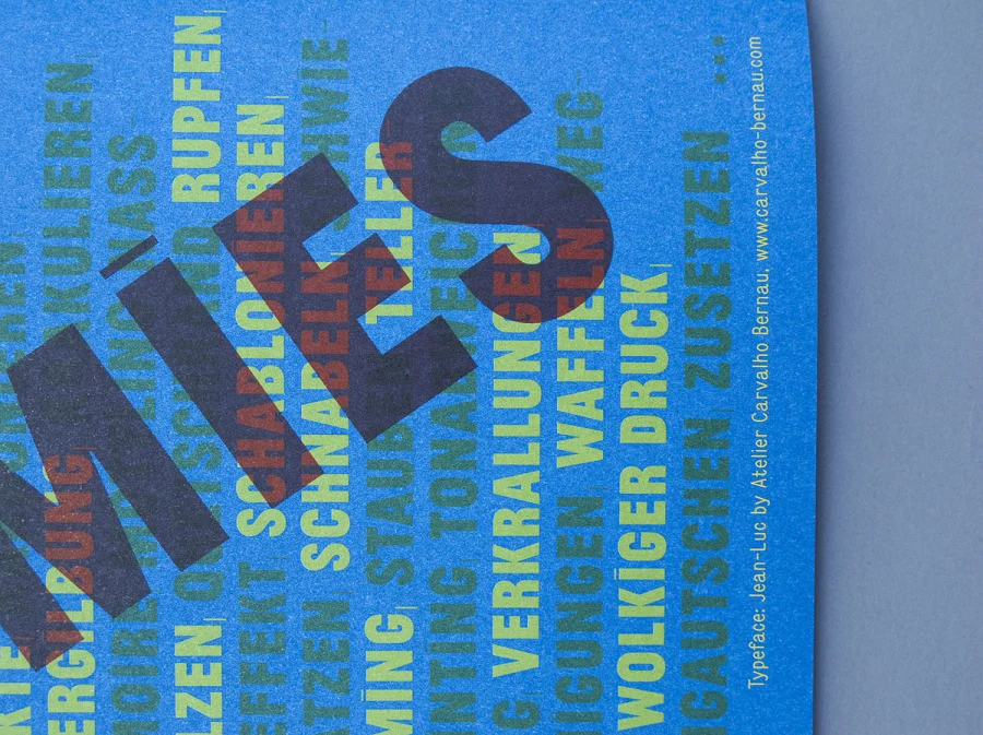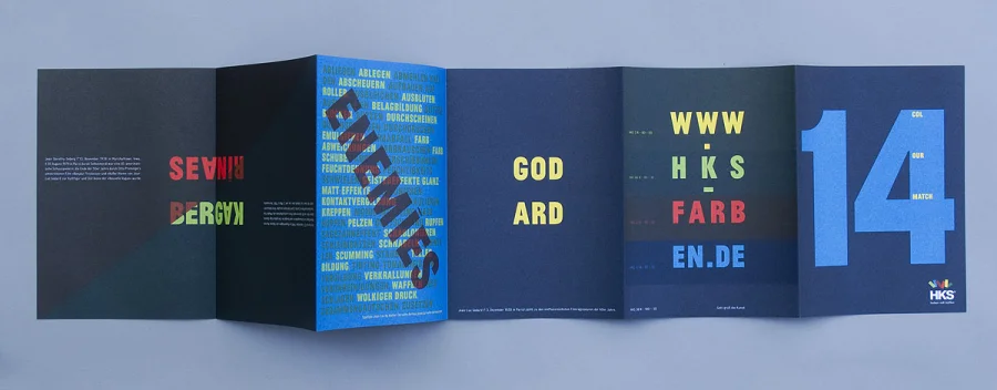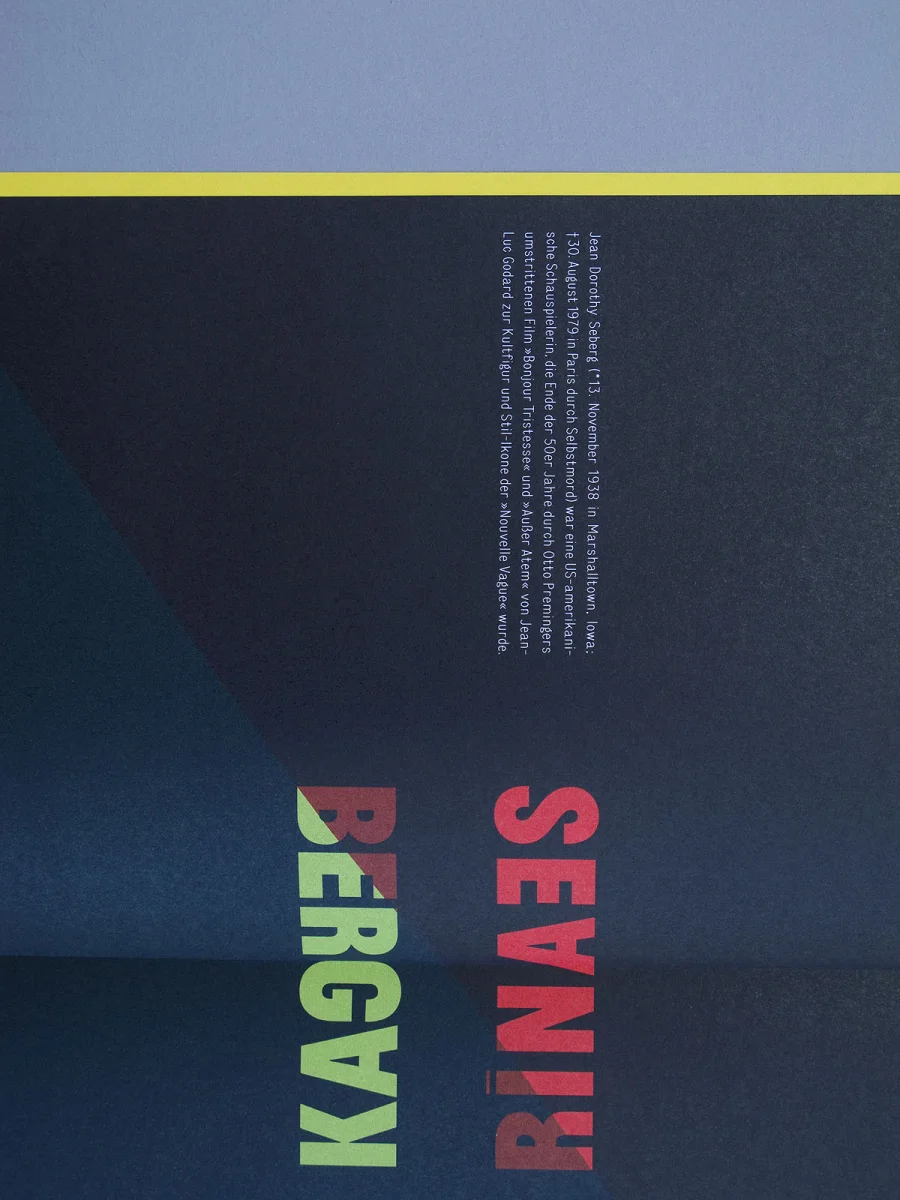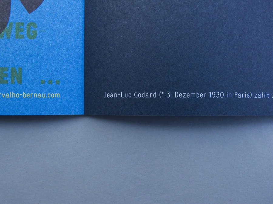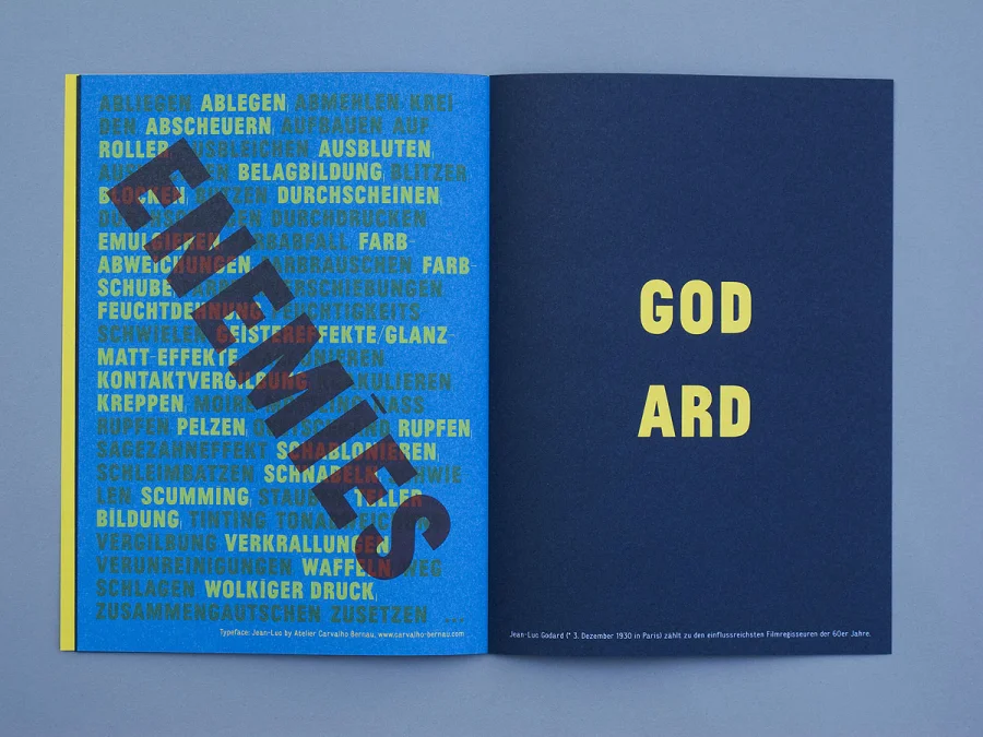 Dieses Mal dreht sich alles um den Regisseur Jean-Luc Godard, zu dessen 80. Geburtstag das Büro Carvalho-Bernau ihm eine eigene Schrift gewidmet hat. Es ist eine Begegnung mit dem Film-Noir – geheimnosvolle Wortspiele und ein rätselhaftes Drucklexikon zitieren seine unvergesslichen Filme. Zum Einsatz kommen einerseits der Font »Jean-Luc«, durch dessen Flächigkeit die HKS-Sonderfarben besonders zum leuchten kommen, andererseits als Mengentextschrift im Lexikon auf den Innenseiten des Colourmatch die »Pantograph« aus dem Studio MakGuill.