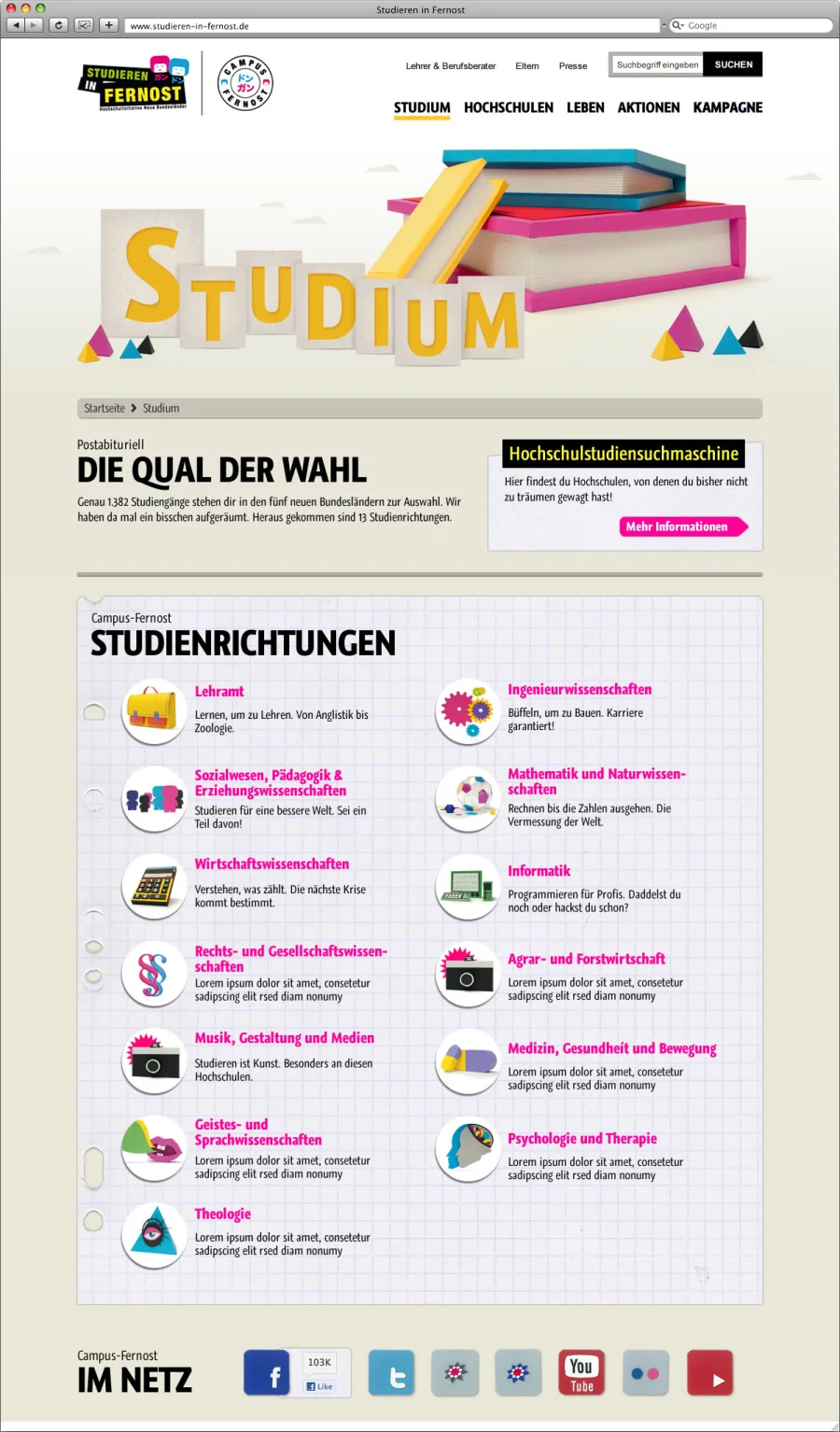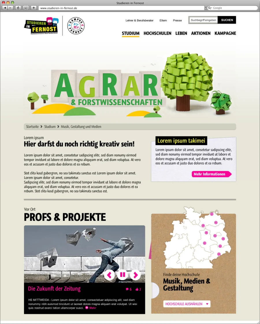 Am 14.04.2011 ist der Kampagnenkern, die Website, in vollständig überarbeiteter Gestaltung online gegangen. Die Site für Studieninteressierte hat jetzt einen stärkeren Themenfokus, bietet zahlreiche direkte Interaktionsmöglichkeiten mit Studierenden und wurde in einem Design gestaltet, das – passend zum Thema „Fernost“ – auf fernöstlicher Origami-Technik basiert.