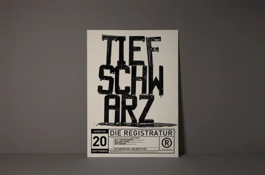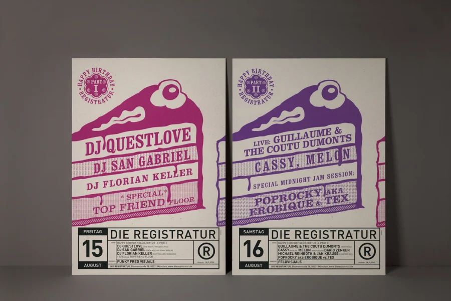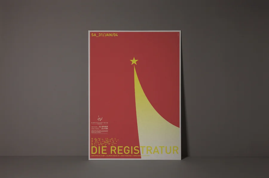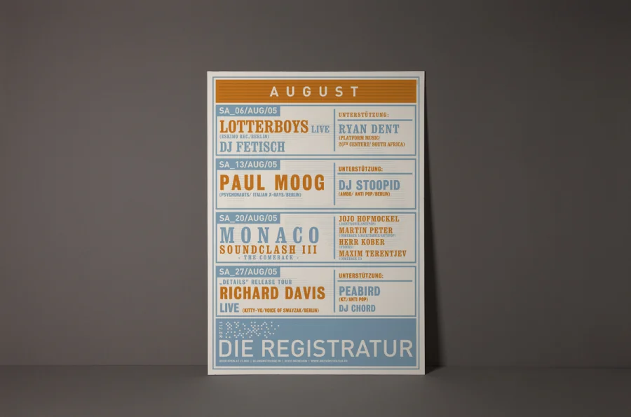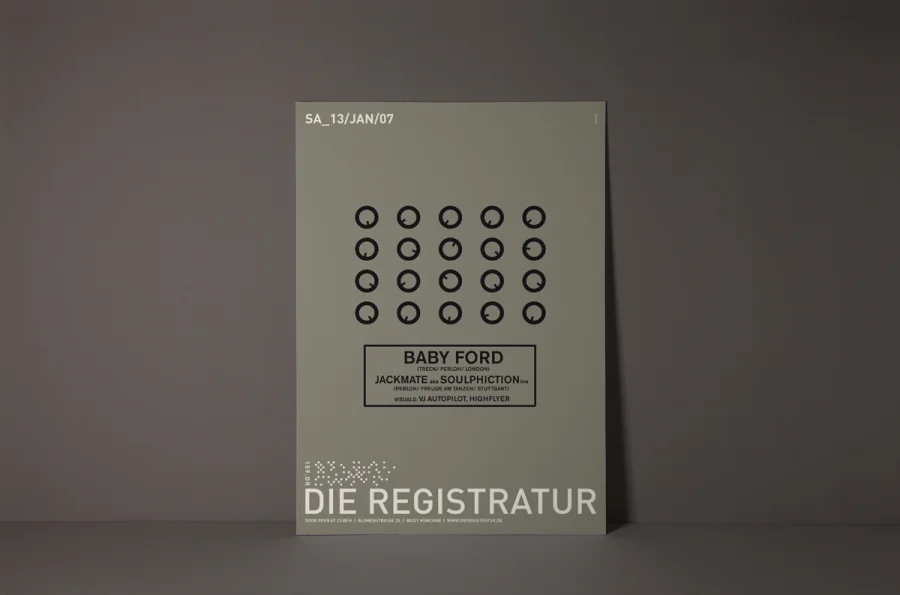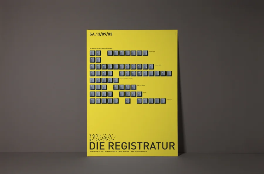 Die Plakate hatten zwei zunächst widersprüchliche Aufgaben zu erfüllen. Einerseits die individuelle Auseinandersetzung mit dem angekündigten Act, so dass die charakteristischen Merkmale der Künstler durch Schlüsselbilder visualisiert werden konnten. Anderseits mussten die Plakate eindeutige Wiedererkennung für die Registratur schaffen. Designliga löste diesen Widerspruch, indem der Begriff „Registratur“ wörtlich genommen wurde. Gestaltungselemente, die an ein behördliches Formularwesen erinnern, wurden als Stilelement über das eigentliche Motiv des Plakates gelegt. Die visuelle Kommunikation des Künstlers darunter erhielt maximalen Freiraum, indem die volle Plakatfläche individuell gestaltet werden konnte. Künstler und Registratur verschmolzen so zu einer funktionalen Einheit. Die Registratur wurde zum Veranstaltungsarchivar. Die Registraturplakate ließen eine damals zum Erliegen gekommene Plakatkultur neu aufleben und prägten ab 2003 bis zur Schließung des Clubs im Jahre 2009 das Münchener Stadtbild.