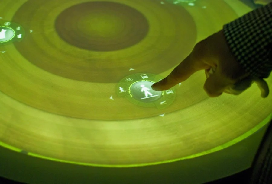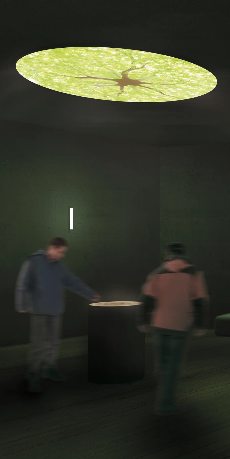 Die interaktive Installation der beiden Diplom-Designer Martin Merten und Bartosz Dronka macht den Zusammenhang zwischen menschlichem Handeln und den Auswirkungen auf die Umwelt direkt erfahrbar. Man stellt am Touchscreen beispielsweise ein, ob man eher Auto fährt oder lieber den Bus oder das Fahrrad nimmt – und erlebt sofort, wie sich Geräuschkulisse und die Projektion des Blätterdachs an der Decke des Raumes entsprechend verändern: Viel Auto, braune Blätter und Motorsägengeräusche – viel Fahrrad, prächtiges grünes Blätterdach und lebendige Regenwaldgeräusche. Auch einem zweiten Faktor trägt die Installation Rechnung: Dem des gemeinschaftlichen Handelns. Die Installation bietet nämlich die Möglichkeit, mit mehreren Personen gleichzeitig verschiedene Parameter zu verändern – so wird deutlich, dass keiner allein verantwortlich ist und alle gemeinsam handeln müssen, um etwas zu bewegen.