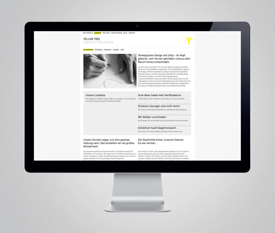 Im Jahr 2004 wird Yellow Tree von den Diplom-Designern Andreas Utsch und Heiko Rafflenbeul gegründet. Die inhabergeführte Agentur für Design und Kommunikation aus Siegen konzipiert und gestaltet charakteristische, visuelle Unternehmensprofile für mittelständische Unternehmen, Kultur- und Non-Profit-Organisationen.