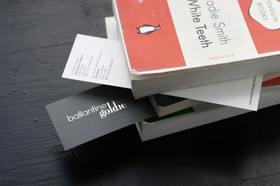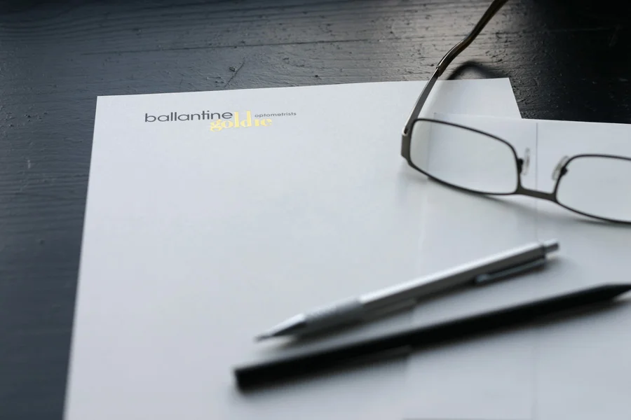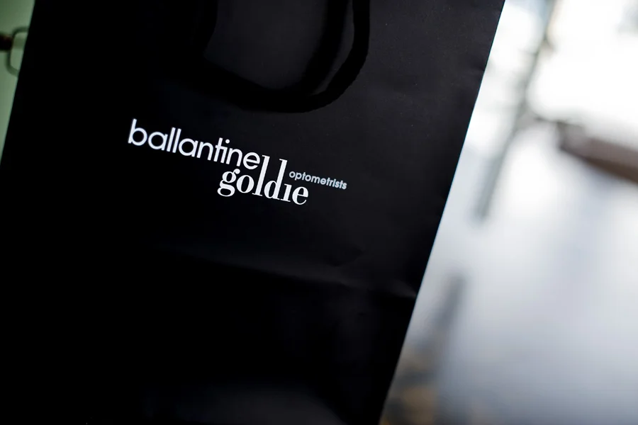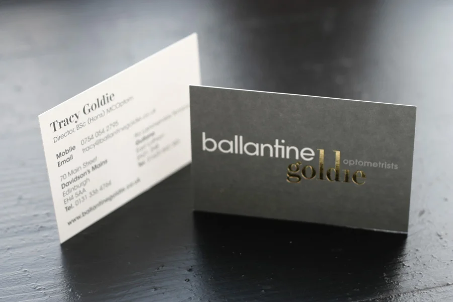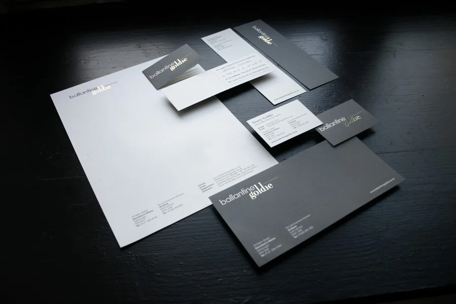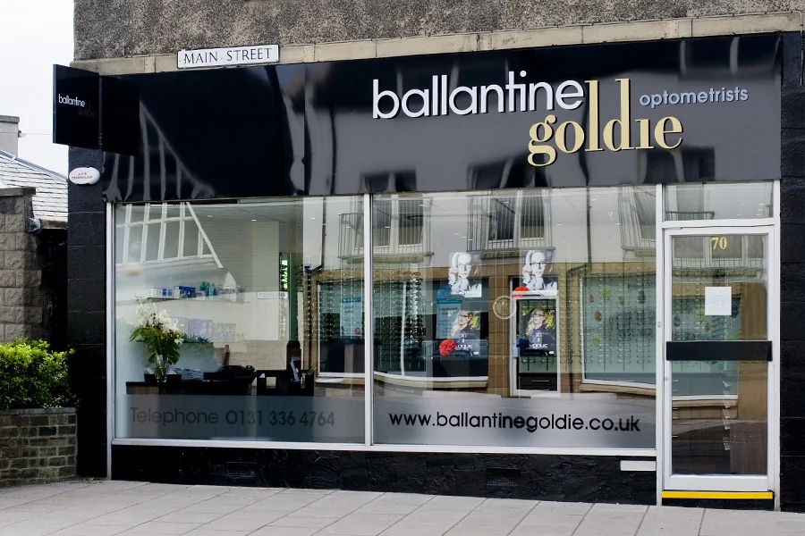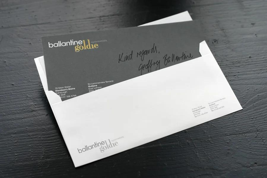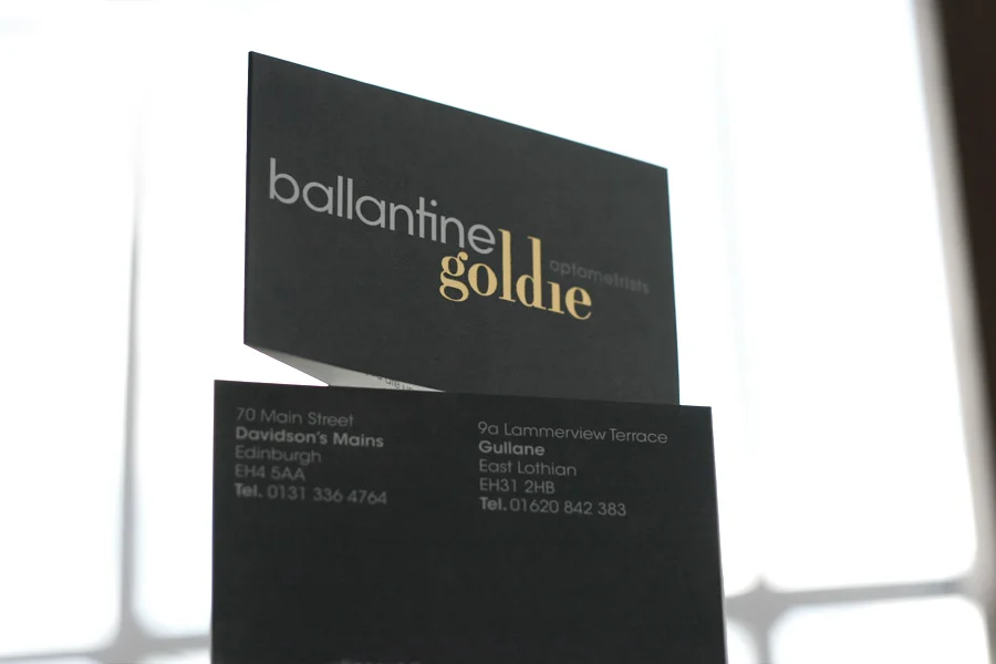 Identität, Druck Materialien, Beschilderung und Webseite für Ballantine Goldie Brillengeschäfte in Edinburgh, Schottland.