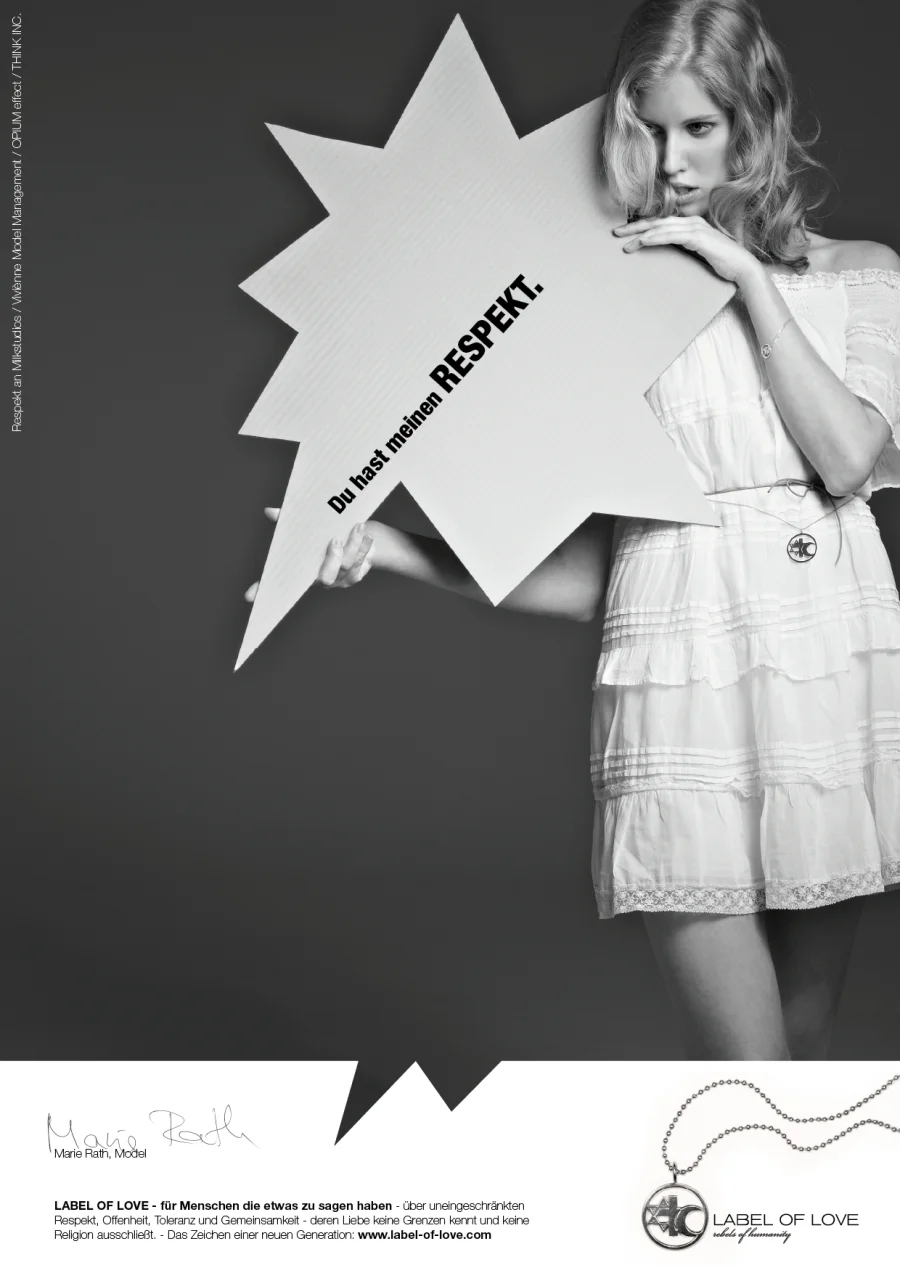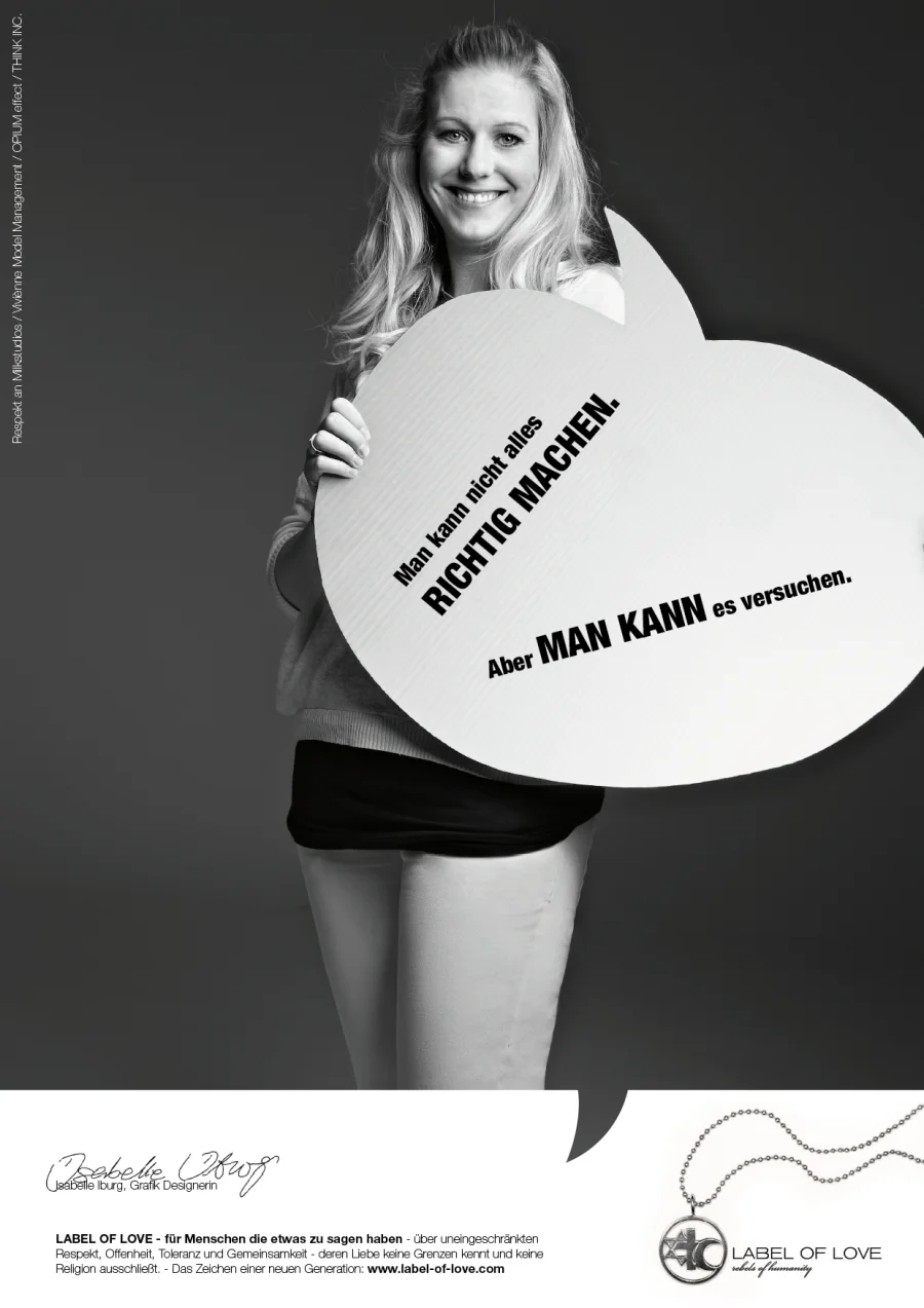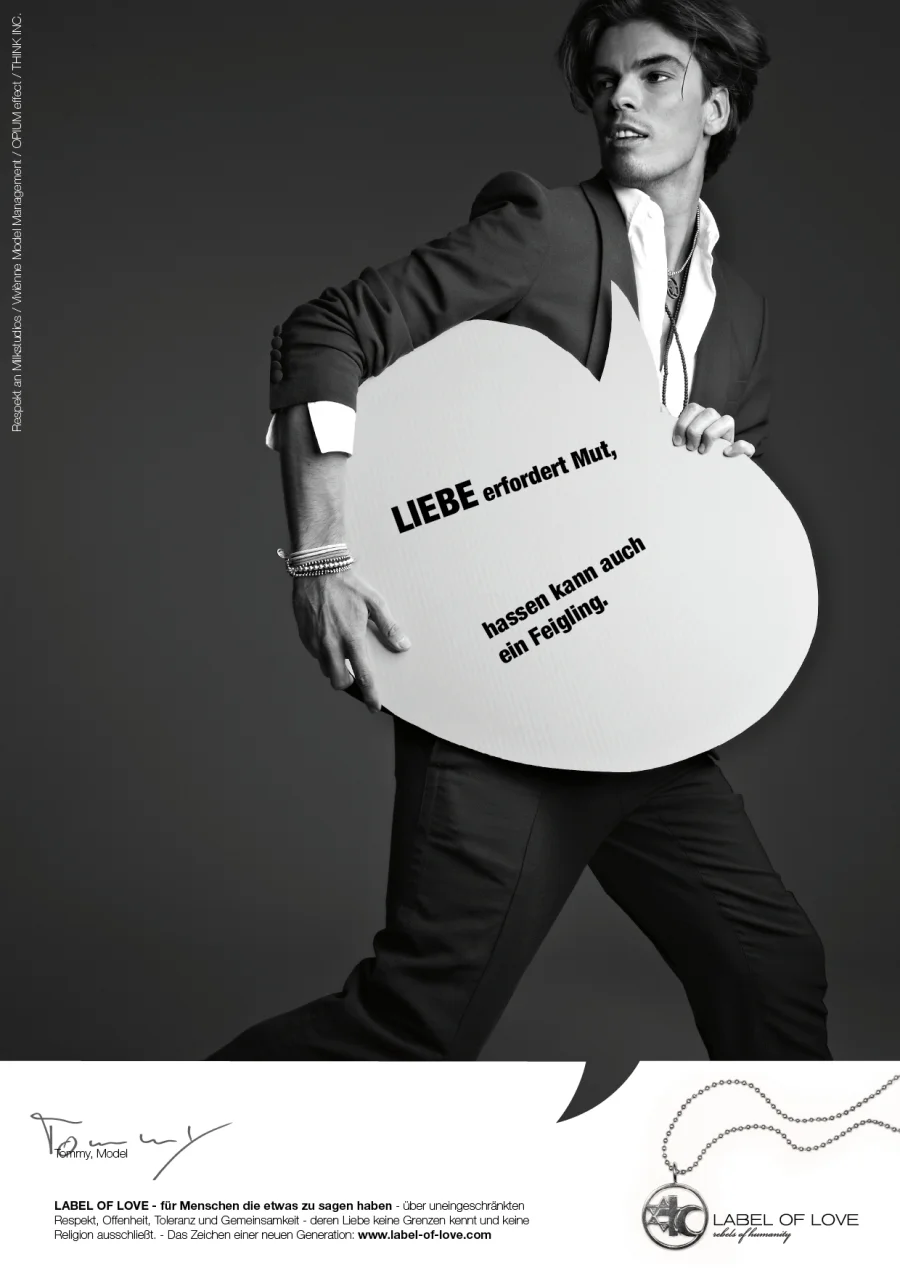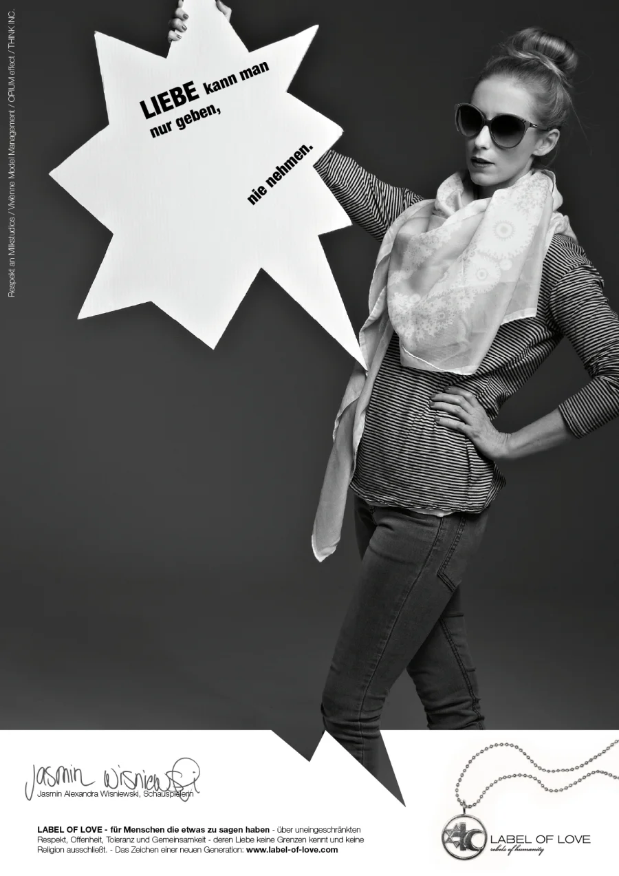 Die Kampagne der Lifestylemarke LABEL OF LOVE trifft den Nerv der Zeit. Die Anzeigenmotive und Filmclips versinnbildlichen genau das, wofür LABEL OF LOVE steht: für ein respektvolles, lebendiges und zeitgemäßes Miteinander. Umgesetzt wurde die Kampagne, die in Print- und Onlineform sowie als Clip-Version kreiert worden ist, mit 14 Personen aus der Mode-, Schauspiel- und Werbebranche. Es sind Menschen, denen oft Oberflächlichkeit nachgesagt wird, da sie sich beruflich bedingt hauptsächlich mit schönen Dingen wie Mode, Beauty und Lifestyle umgeben. Aber sie haben wie alle etwas zu sagen. Die Copy-Zeilen auf den Bildern entstammen direkt von den Protagonisten selbst. Die Kampagnenaussage „Wir haben was zu sagen“ wird durch Sprechblasen aus Pappmaschee untermauert, mit denen die Protagonisten nonverbal ihre Gedanken zum aktuellen Zeitgeschehen demonstrieren. Ziel der Kampagne ist es, Menschen für das Thema Toleranz zu sensibilisieren und auf das Produkt aufmerksam zu machen.