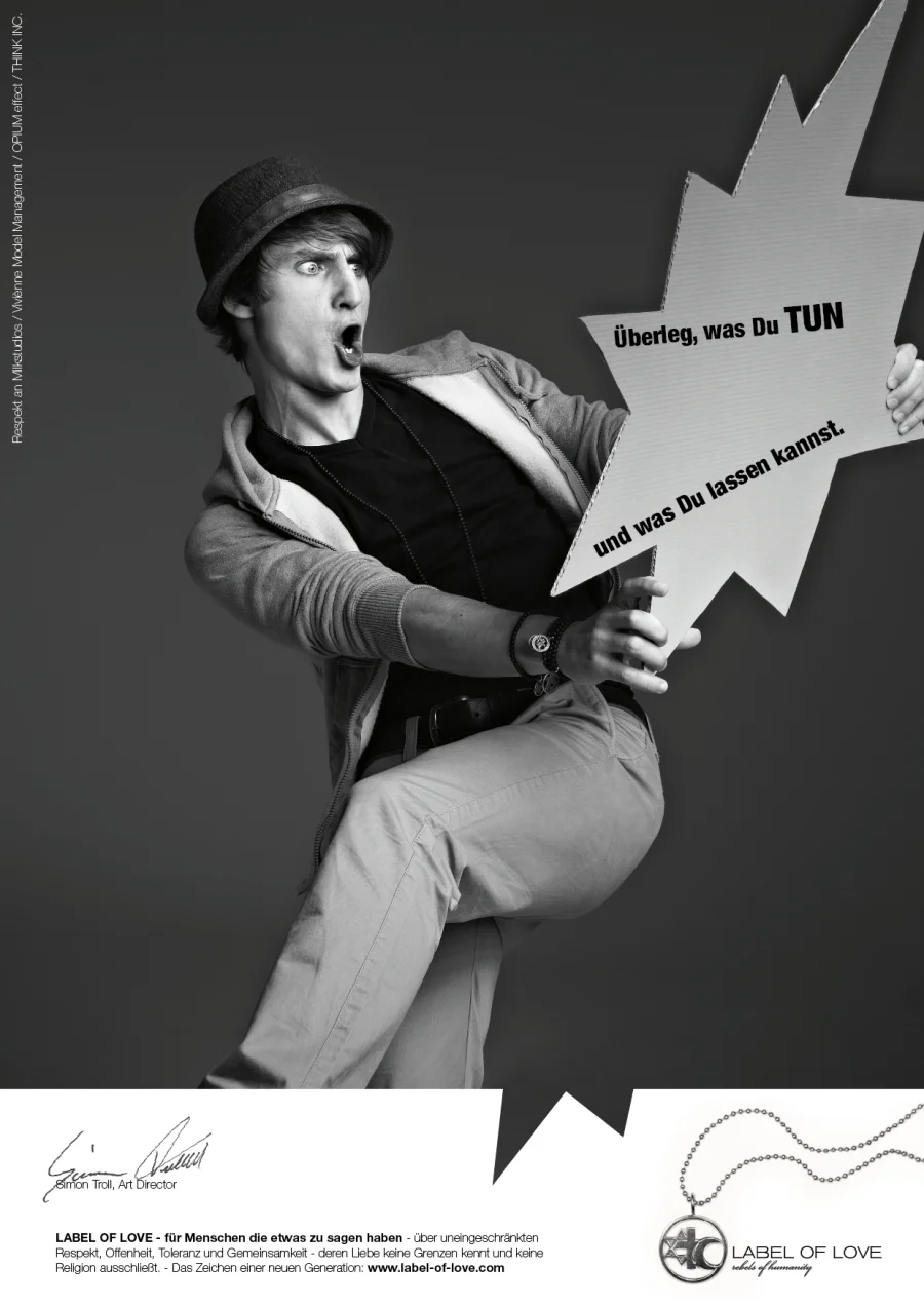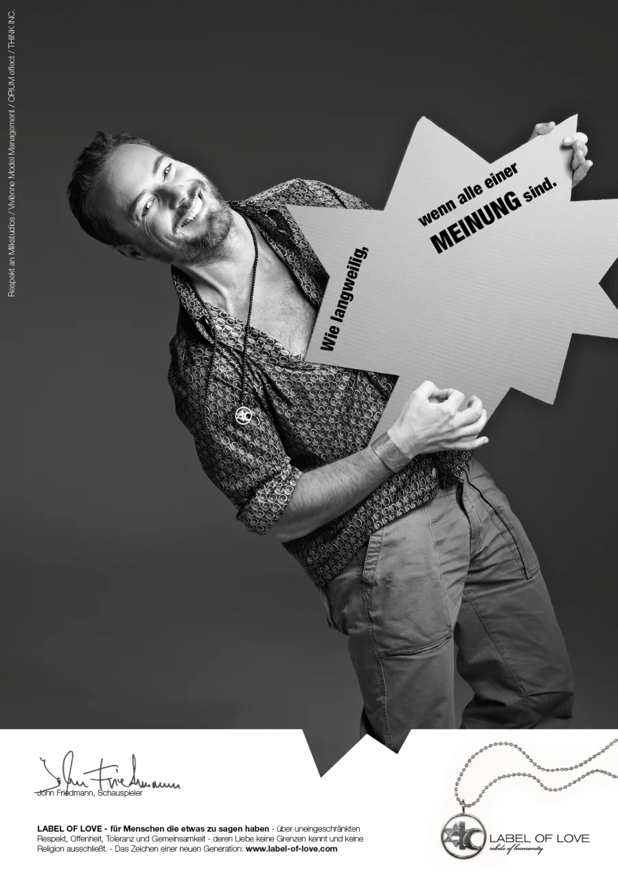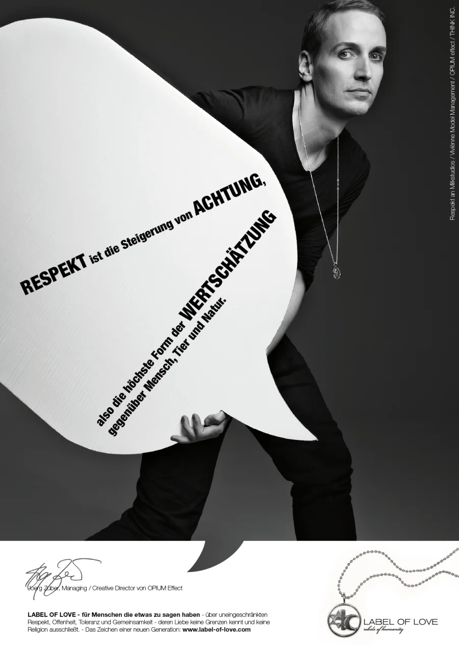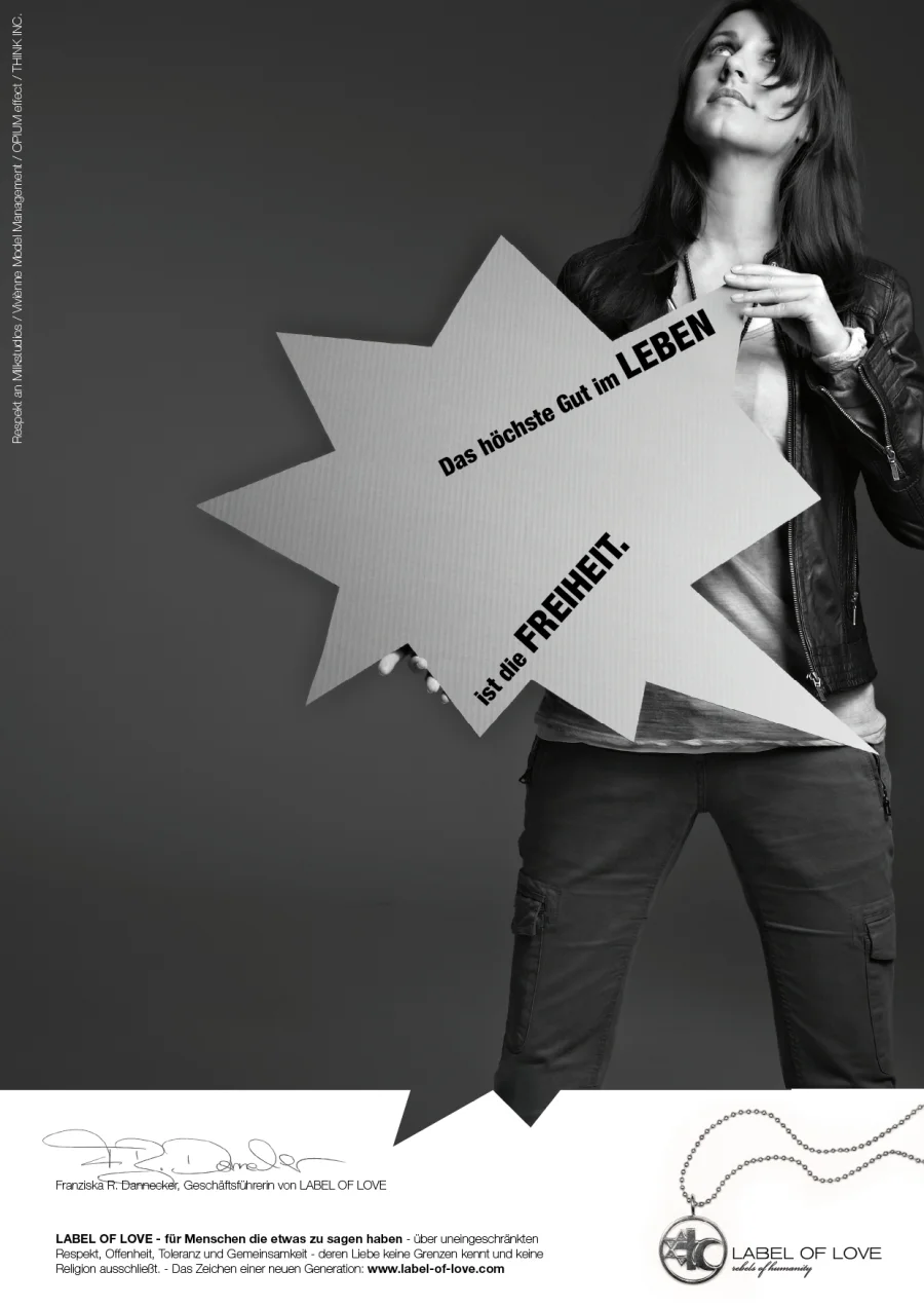 Die Kampagne der Lifestylemarke LABEL OF LOVE trifft den Nerv der Zeit. Die Anzeigenmotive und Filmclips versinnbildlichen genau das, wofür LABEL OF LOVE steht: für ein respektvolles, lebendiges und zeitgemäßes Miteinander. Umgesetzt wurde die Kampagne, die in Print- und Onlineform sowie als Clip-Version kreiert worden ist, mit 14 Personen aus der Mode-, Schauspiel- und Werbebranche. Es sind Menschen, denen oft Oberflächlichkeit nachgesagt wird, da sie sich beruflich bedingt hauptsächlich mit schönen Dingen wie Mode, Beauty und Lifestyle umgeben. Aber sie haben wie alle etwas zu sagen. Die Copy-Zeilen auf den Bildern entstammen direkt von den Protagonisten selbst. Die Kampagnenaussage „Wir haben was zu sagen“ wird durch Sprechblasen aus Pappmaschee untermauert, mit denen die Protagonisten nonverbal ihre Gedanken zum aktuellen Zeitgeschehen demonstrieren. Ziel der Kampagne ist es, Menschen für das Thema Toleranz zu sensibilisieren und auf das Produkt aufmerksam zu machen.