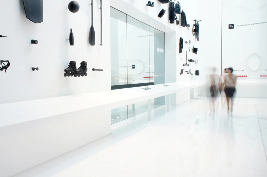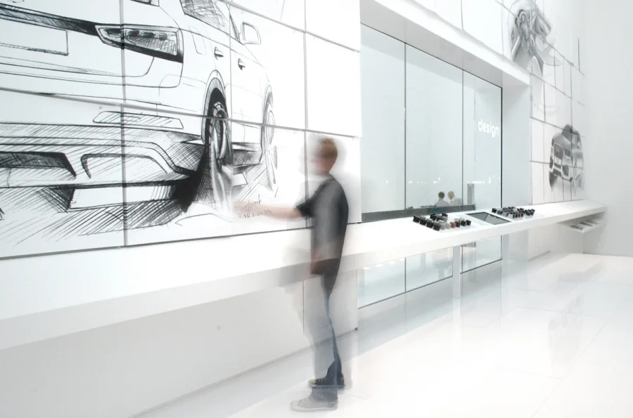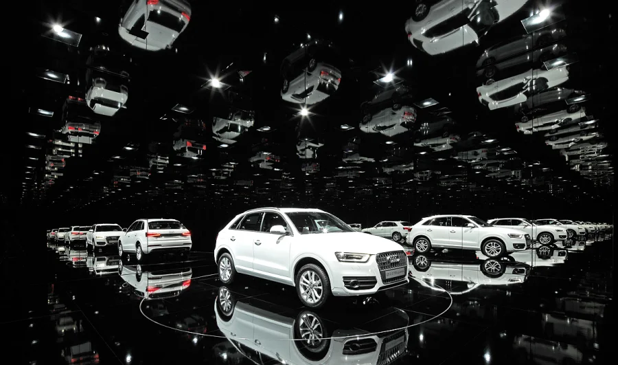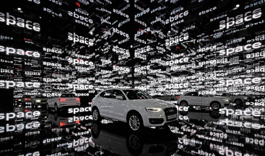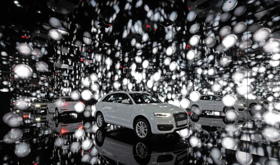 Auch die Innenwände des »Qube3« bestehen durchgehend aus Spiegelglas. So wird der Gast beim Betreten sowohl Zuschauer als auch selber Teil eines eindrucksvollen Schauspiels: Der Raum vervielfacht ihn und den in der Mitte auf einer Drehbühne platzierten Audi Q3 ins Unendliche. In Kombination mit einer experimentellen Bespielung entsteht ein einzigartiges Raumerlebnis.