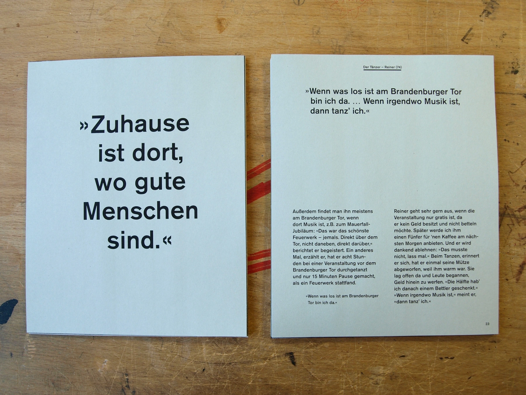 Das Buch ist nicht gebunden und wird durch eine Paketschnur zusammengehalten. Uunterschiedliche Papierfarben erleichtern die Orientierung. Die Form spiegelt den Inhalt – und somit das ungesicherte Dasein der Befragten.