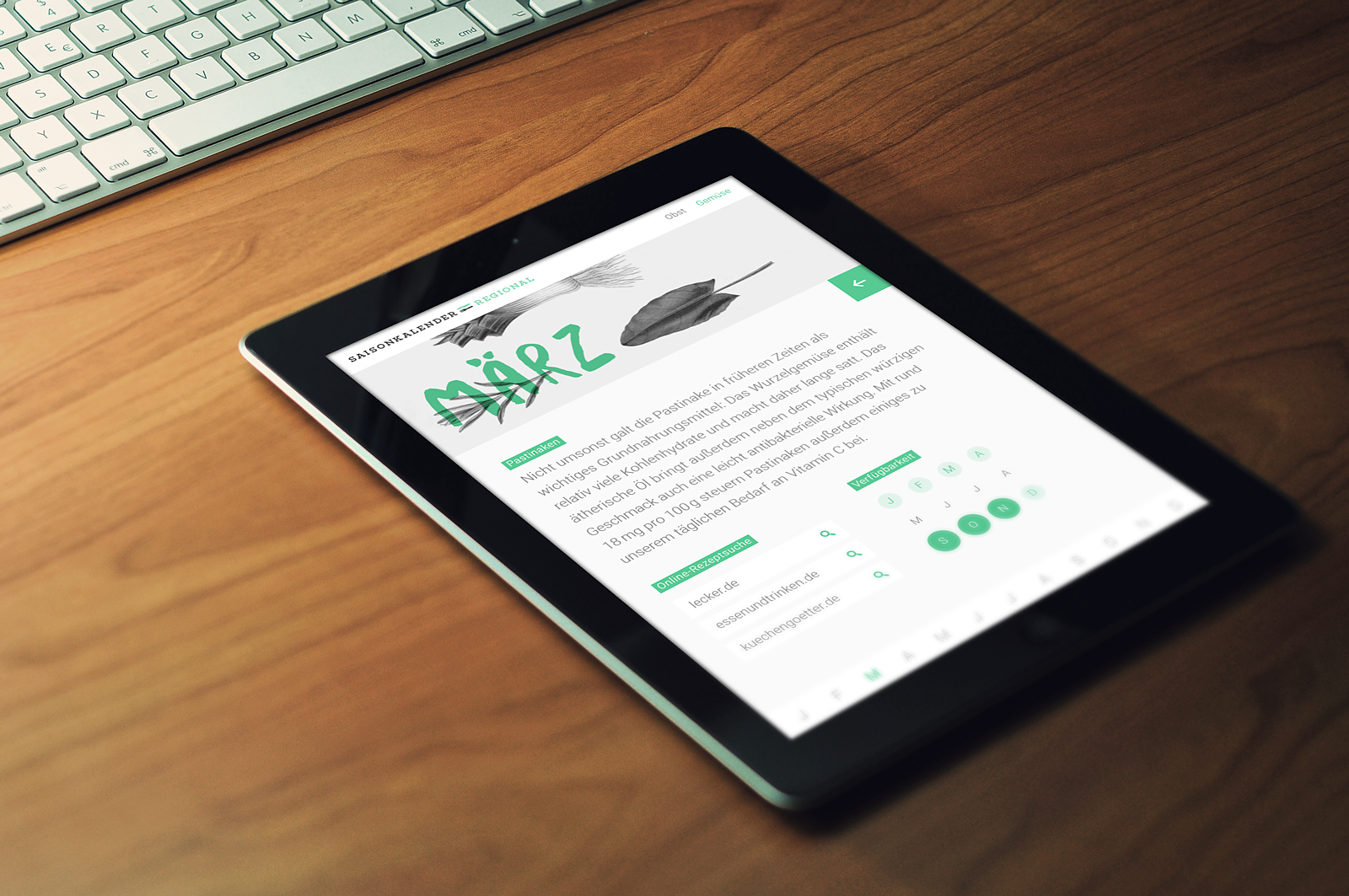 Interaktiver Saisonkalender mit monatlicher Übersicht über regionales Obst und Gemüse und direkten Links zu Rezeptideen.
