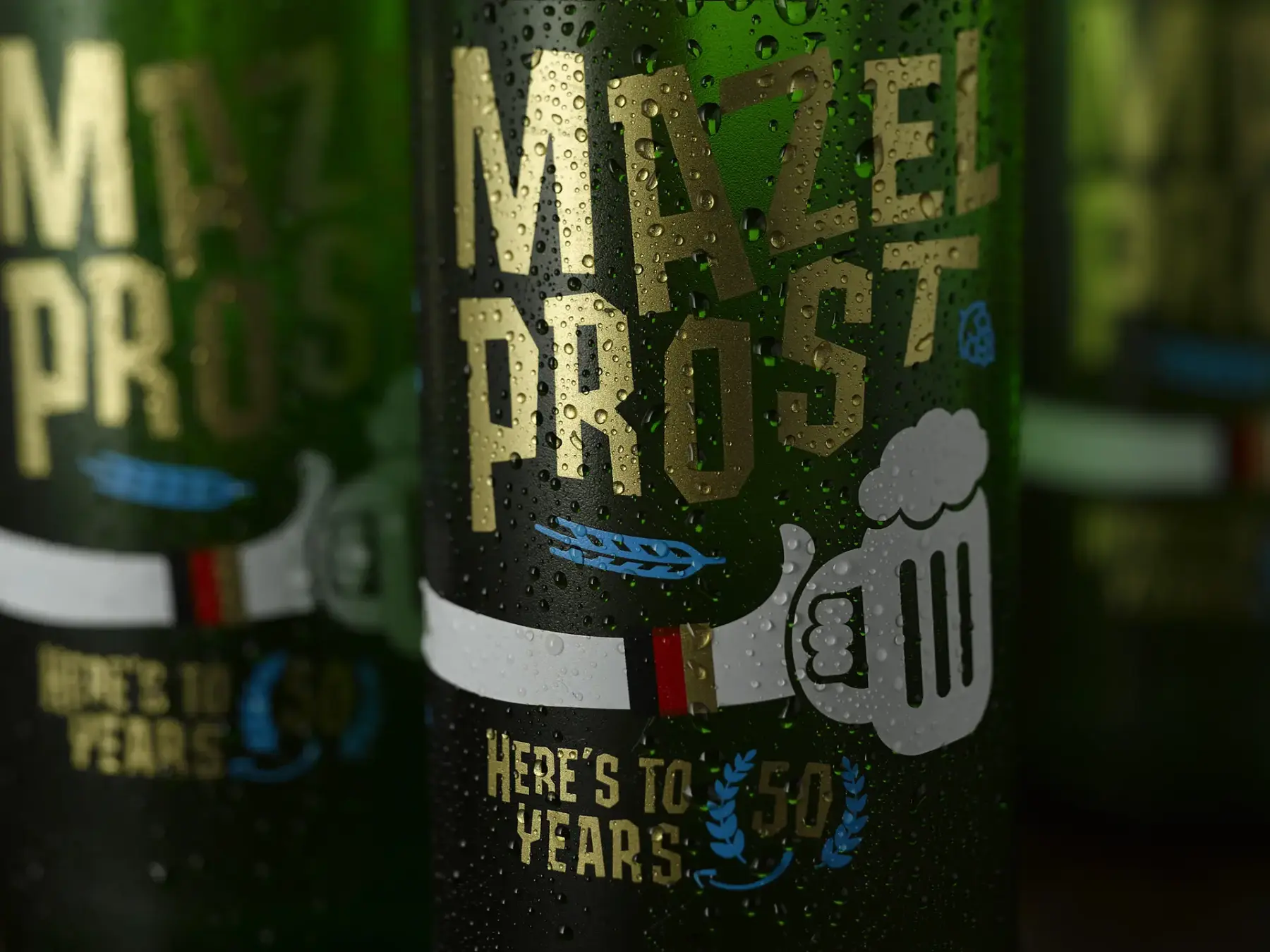 Mazelprost ist das offizielle Getränk der deutsch-israelischen Freundschaft, interpretiert diese Ehre jedoch humorvoll und bodenständig. Siegel, Farbgebung und das transparente Etikett spiegeln Trends aus dem Craft-Beer-Segment wider und machen Mazelprost zu einem optimistischen, modernen Getränk.