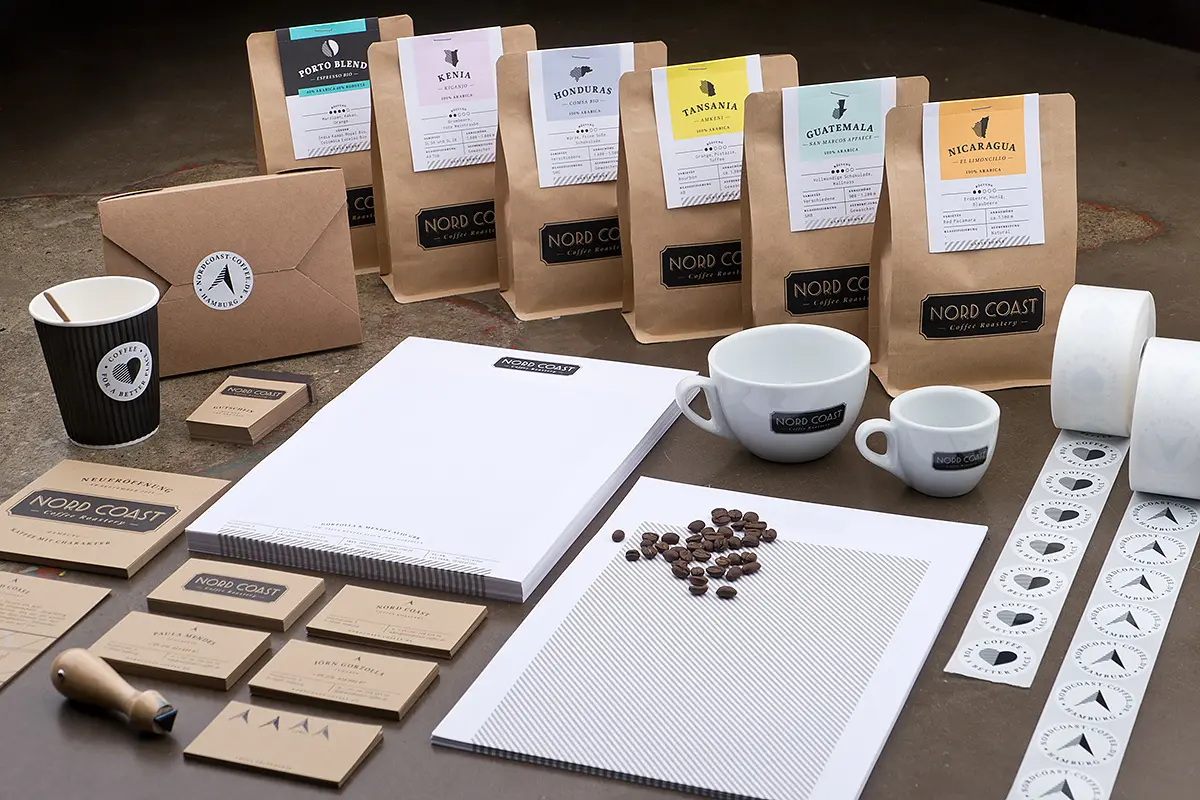 Es wurde ein ganzheitliches Corporate Design geschaffen und dieses in sämtlichen Printmedien, bei der Verpackung und im Raum umgesetzt. Der Gesamtauftritt bringt die große Leidenschaft zum Ausdruck, mit der sich die Kaffeerösterei Nord Coast dem Kaffee widmet.