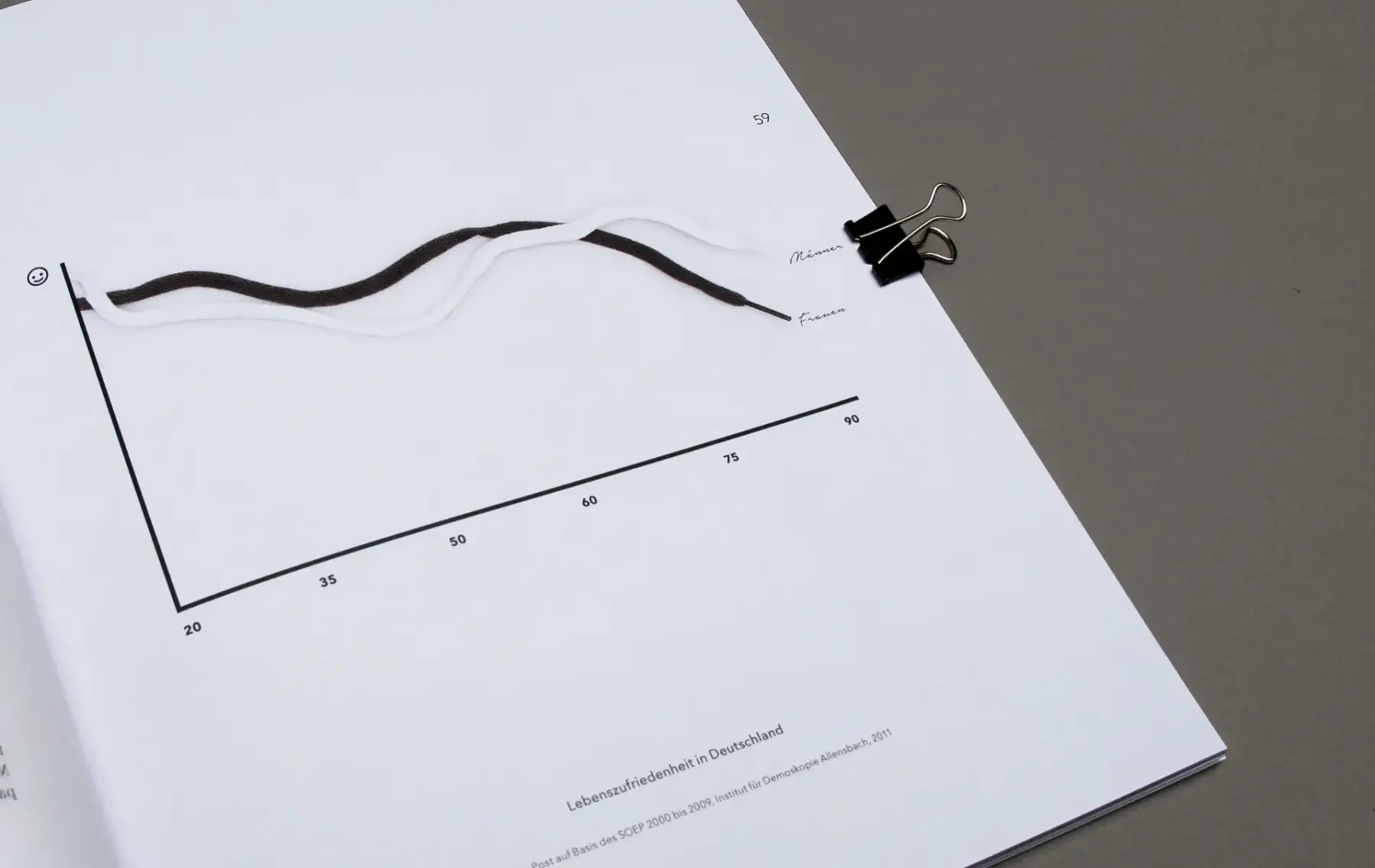 Was, wenn Glück ein Unternehmen wäre? “don’t worry” ist ein Geschäftsbericht, der sich inhaltlich an klassischen Geschäftsberichten orientiert: Er zeigt die Glücks-Aktie, die Konzernstrategie, den aktuellen Lagebericht und vieles mehr. Glücksförderer wie Nudeln, Musik oder Bier dienen als Infografiken.