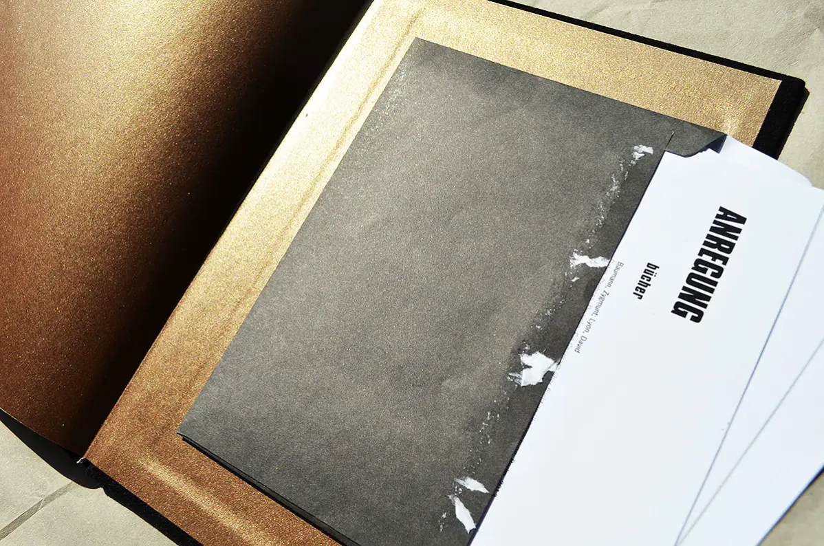 Besonderheiten: Vorsatzpapier (Fedrigoni Sirio Pearl Fusion Bronze) Transparentpapier, Klarsichtfolie, verschlossene Seite, Spiegelfolie