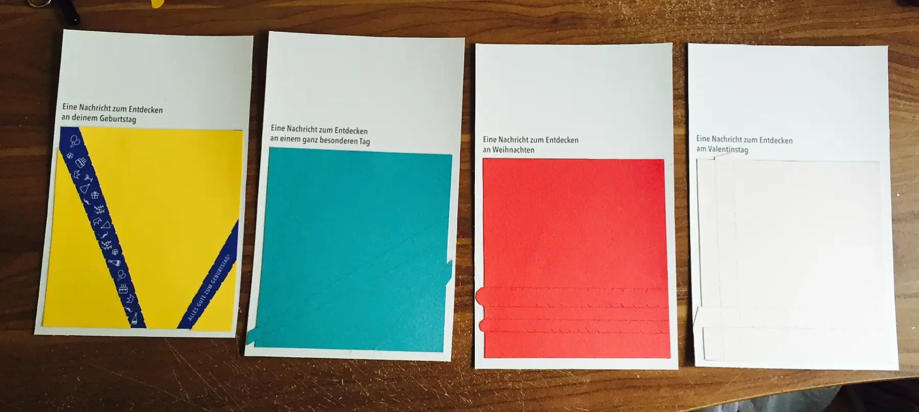 Interaktive Grußkarte, in welcher, je nach Thema, passende Nachrichten versteckt sind. Durch die Aktion, das Papier abzureißen und die versteckte Botschaft zu entdecken, bekommen die Briefempfänger Freude, weil man nicht passiver Zuschauer bleibt, sondern ein aktiver Teilnehmer wird.