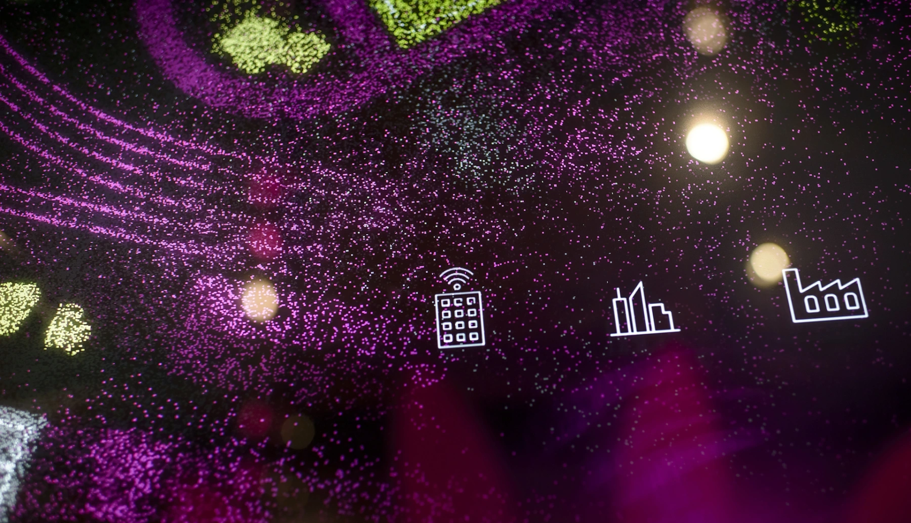 Die aus Partikeln bestehenden Animationen des Exponats symbolisieren die flächendeckende Sensorik auf der LPWA und damit auch das IoT basiert.