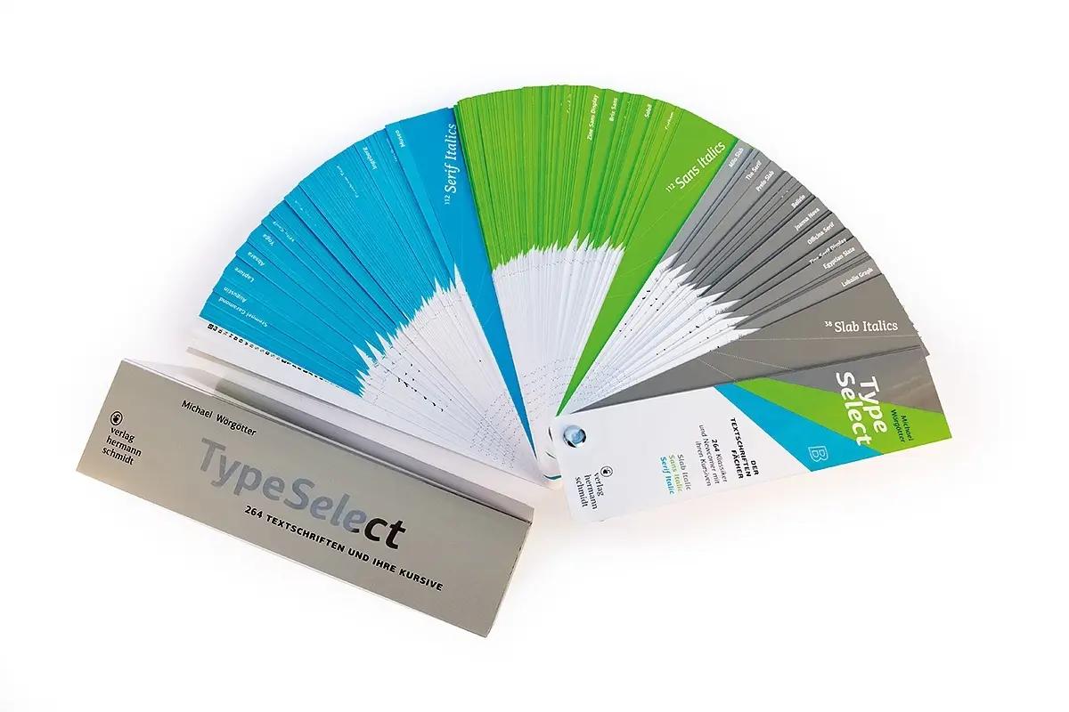 Bestandteil des Designberufes sind während des Gestaltungsprozesses immer wieder Entscheidungen, die es zu treffen gilt und die breit gefächert sind. Das ist bei Farben so und besonders bei der Wahl der Typografie. Für ersteres sind Farbfächer schon lange Gang und Gäbe, vermutlich hat jeder Gestalter, der zumindest ab und an mit Print arbeitet Pantone oder HKS Fächer in der Schreibtisch-Schublade liegen.