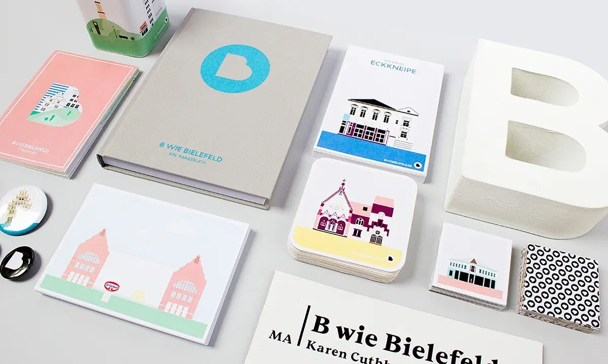 Mit den erstellten Illustrationen werden neben den klassischen Werbemitteln auch zahlreiche Merchandise Produkte, von der Postkarte bis hin zum Jutebeutel, flexibel und individuell bespielt. Die zusätzlich entwickelte Wortbildmarke »B wie Bielefeld« dient dabei als Absenderzeichen. Sie macht die Imagekampagne (wider)erkennbar. Nicht nur die unendlichen Gestaltungsmöglichkeiten der Illustrationen, sondern auch die verschiedenen Farben, kombinierten Schriften und unterschiedlichen Kommunikationswege machen klar, dass Bielefeld alles andere als die langweilige, graue Maus der Region Ostwestfalen-Lippe ist.